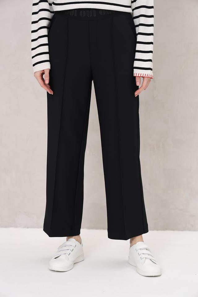 Модель имеет прямой крой и клёш от колена, что визуально удлиняет ноги и придает образу женственность. Брюки оснащены эластичным поясом, обеспечивающим удобную посадку по фигуре. Наличие продольных вытачек спереди добавляет брюкам элегантности и подчеркивает силуэт.