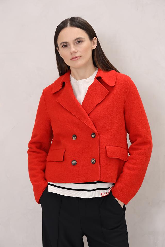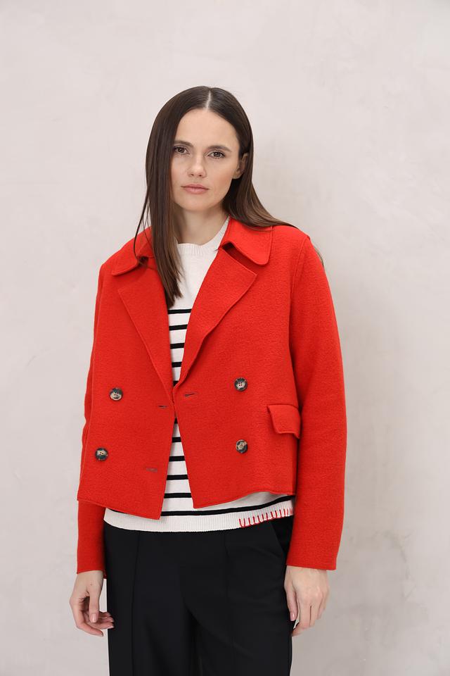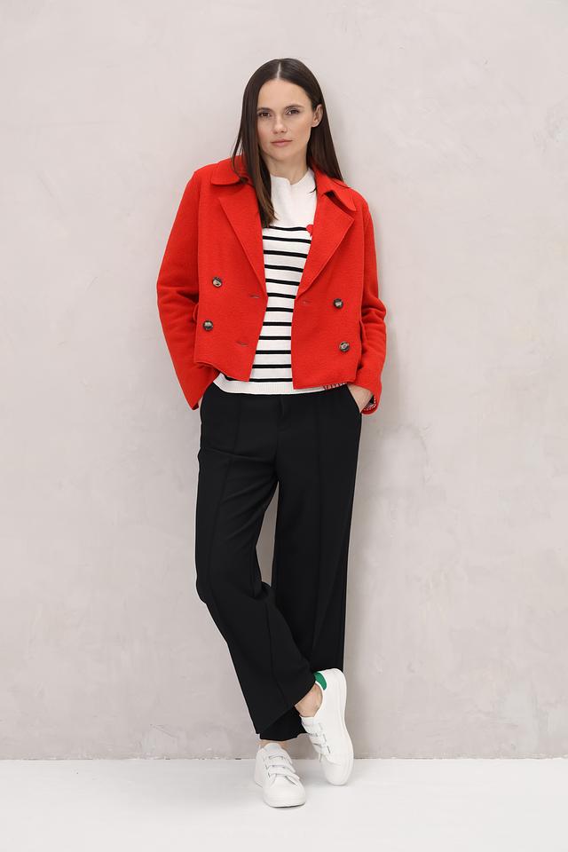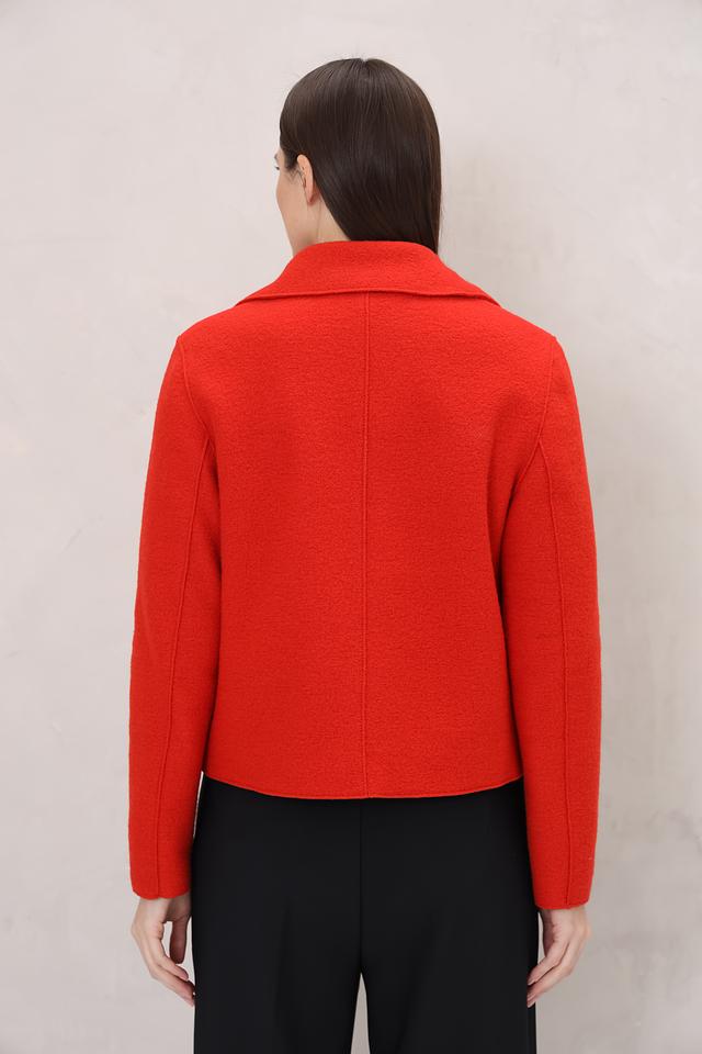 Жакет выполнен из высококачественной 100% шерсти, что обеспечивает комфорт и тепло в прохладную погоду. Двубортная застежка на пуговицы подчеркивает элегантность силуэта. У жакета есть функциональные карманы.