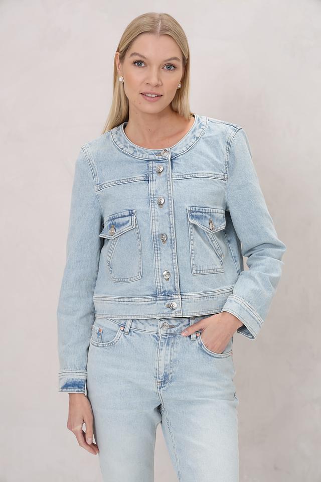 Жакет Oui голубого цвета выполнен из денима с застежкой на пуговицы. Модель имеет короткий крой и накладные карманы, что придает ей стильный и современный вид. Идеально дополнит повседневный образ. Состав: хлопок 97%, полиэстер 2%, эластан 1%