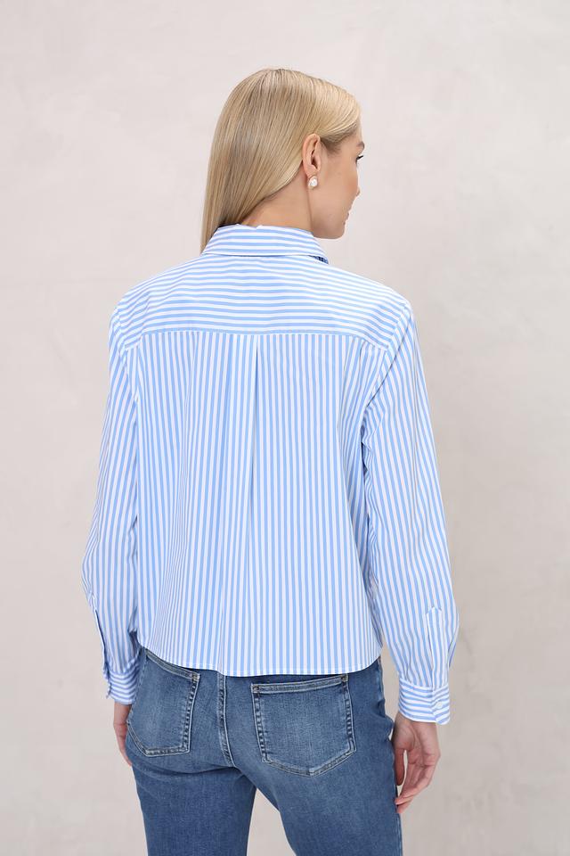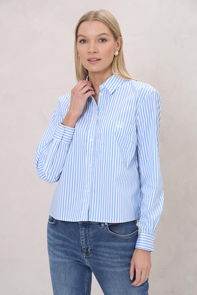 Голубая рубашка Oui с длинным рукавом выполнена в классическую полоску. Модель имеет прямой крой, воротник и застежку на пуговицы. Идеально подходит для создания повседневных образов. Состав: хлопок 78%, полиамид 20%, эластан 2%