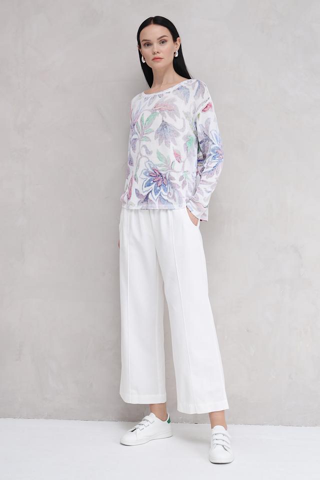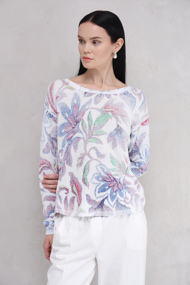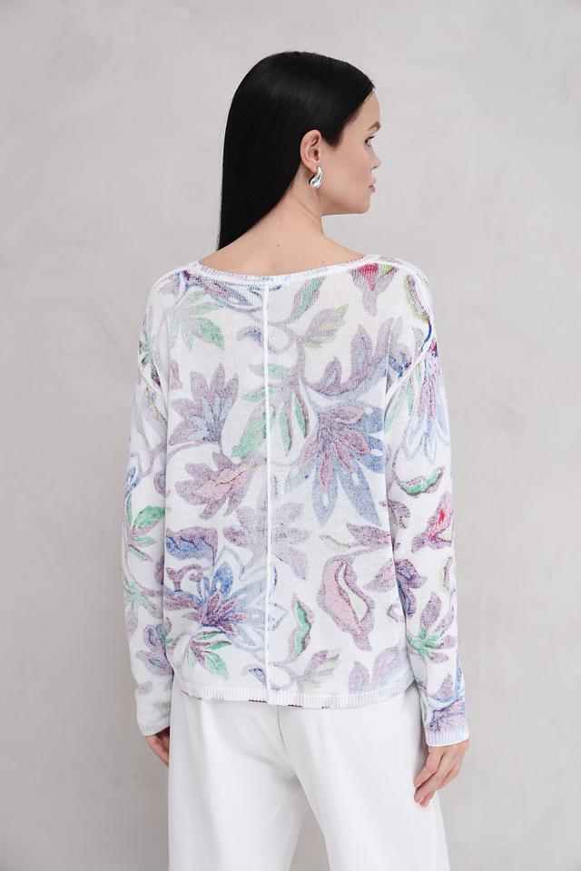 Дизайн пуловера отличается округлым вырезом горловины и длинными рукавами. Принт выполнен в технике акварели, с использованием различных оттенков синего, розового, зеленого и фиолетового, создавая эффект легкости и воздушности.