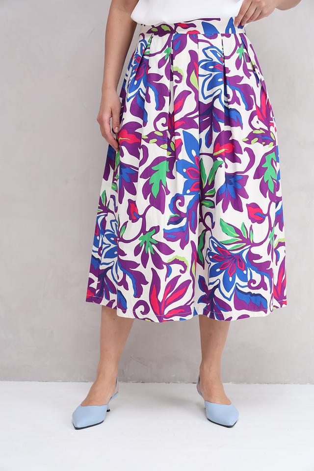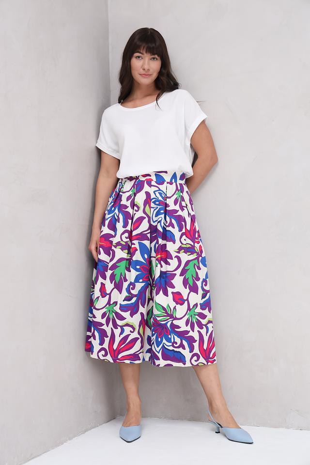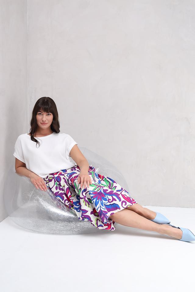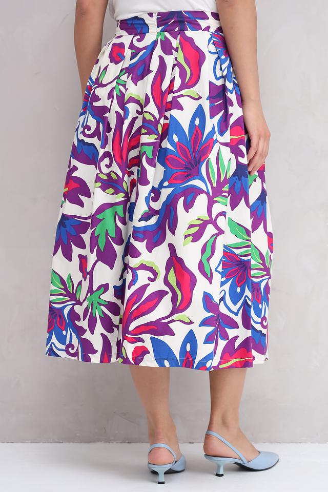 Юбка от бренда Oui выполнена в белом цвете с ярким цветочным принтом. Модель имеет расклешенный силуэт и длину миди, идеально подходит для создания стильных образов. Состав: хлопок 100%