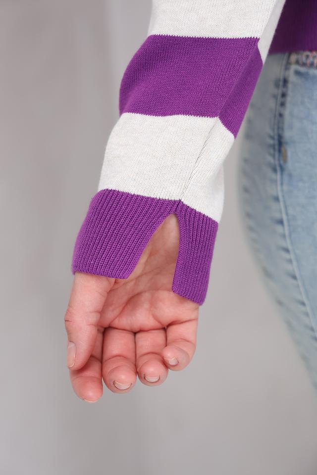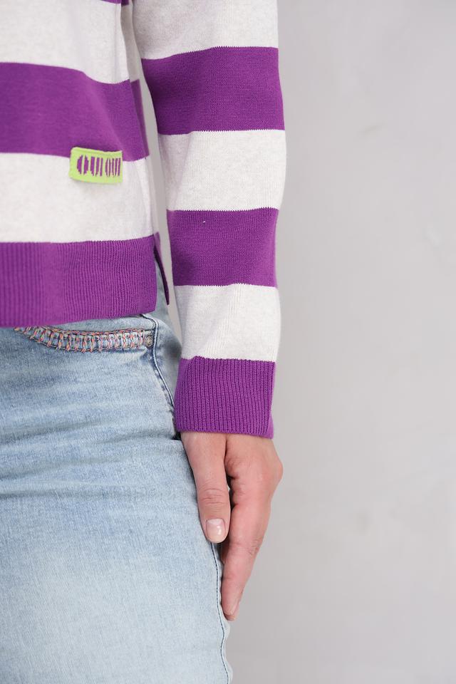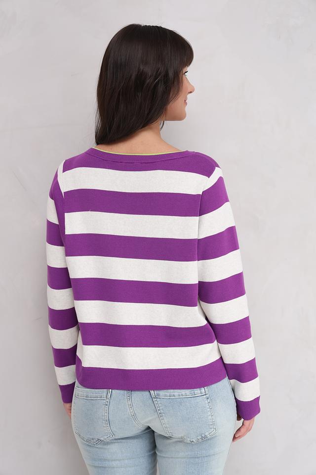 Этот женский пуловер от бренда Oui выполнен в классическом стиле с широкой полоской. Преобладающий цвет – насыщенный фиолетовый, чередующийся с белым. Пуловер имеет круглый вырез горловины, который дополнен тонкой отделкой лаймового цвета.
