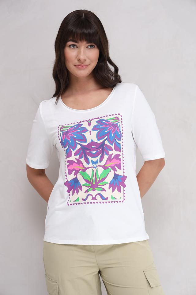 Особенностью данной модели является яркий цветочный принт, выполненный в фиолетовых, розовых и зеленых тонах. Принт расположен в центральной части футболки и придает ей оригинальный и свежий вид.