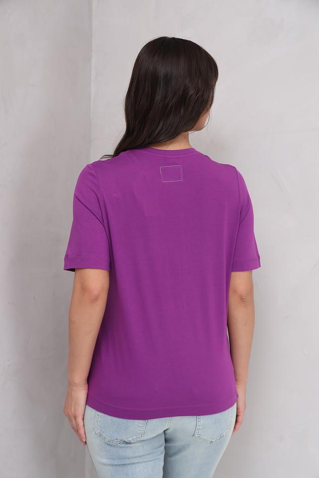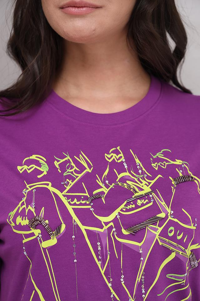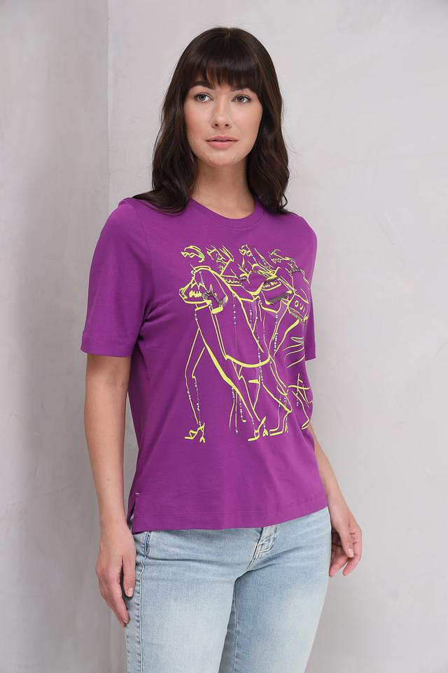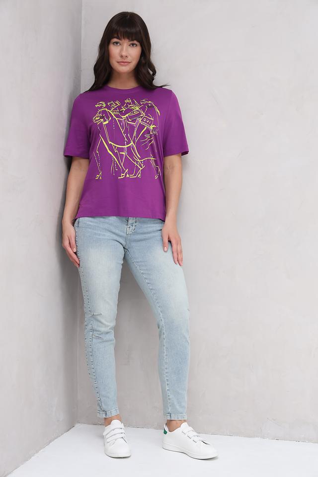 Женская футболка Oui фиолетового цвета с оригинальным принтом в виде танцующих фигур. Изготовлена из 100% хлопка, обеспечивающего комфорт и воздухопроницаемость. Стильный и удобный вариант для повседневного образа. Состав: хлопок 100%