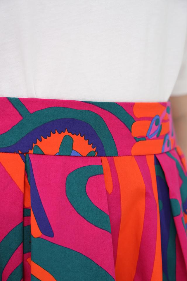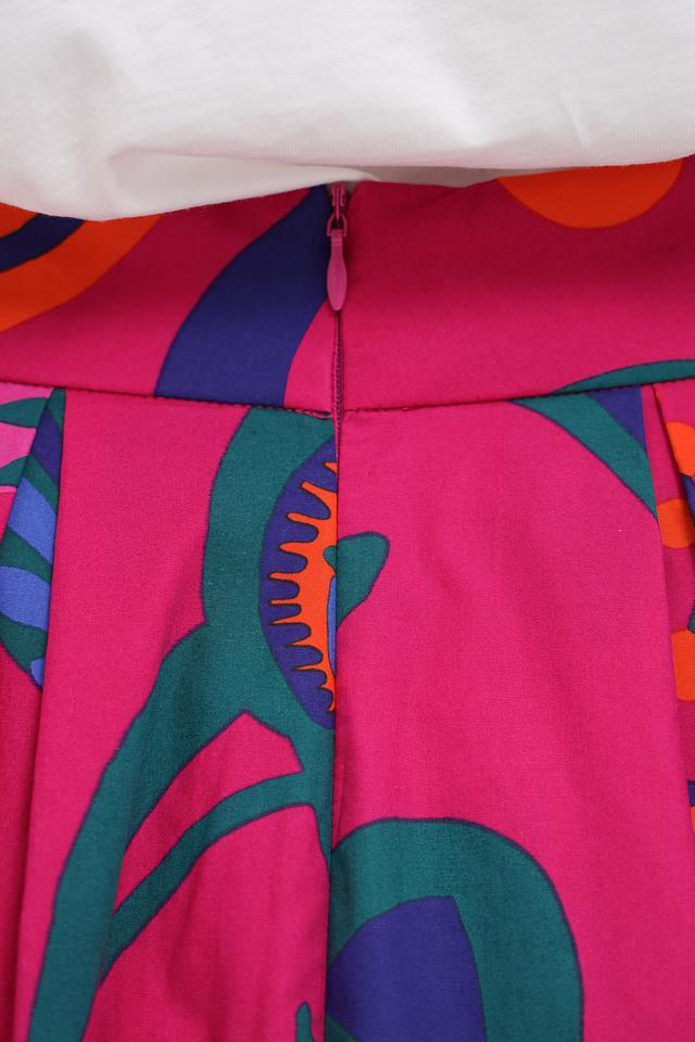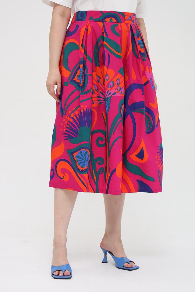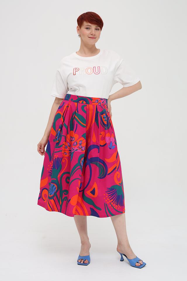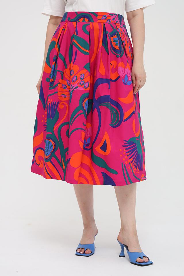 Юбка имеет расклешенный силуэт и длину миди, что делает ее универсальной для различных случаев. Главная особенность этой модели – эффектный цветочный принт, выполненный в ярких и насыщенных оттенках.