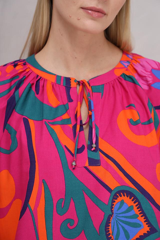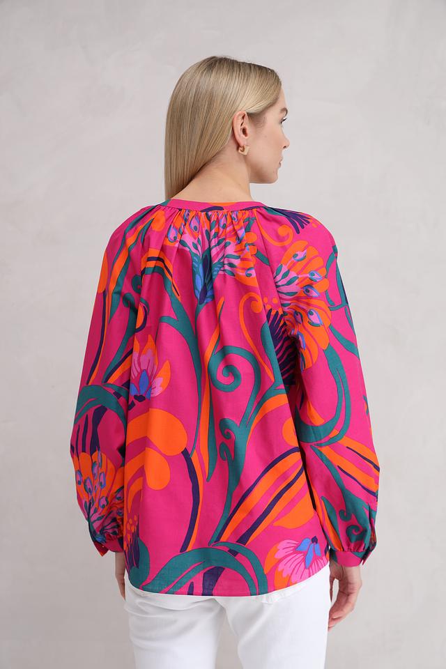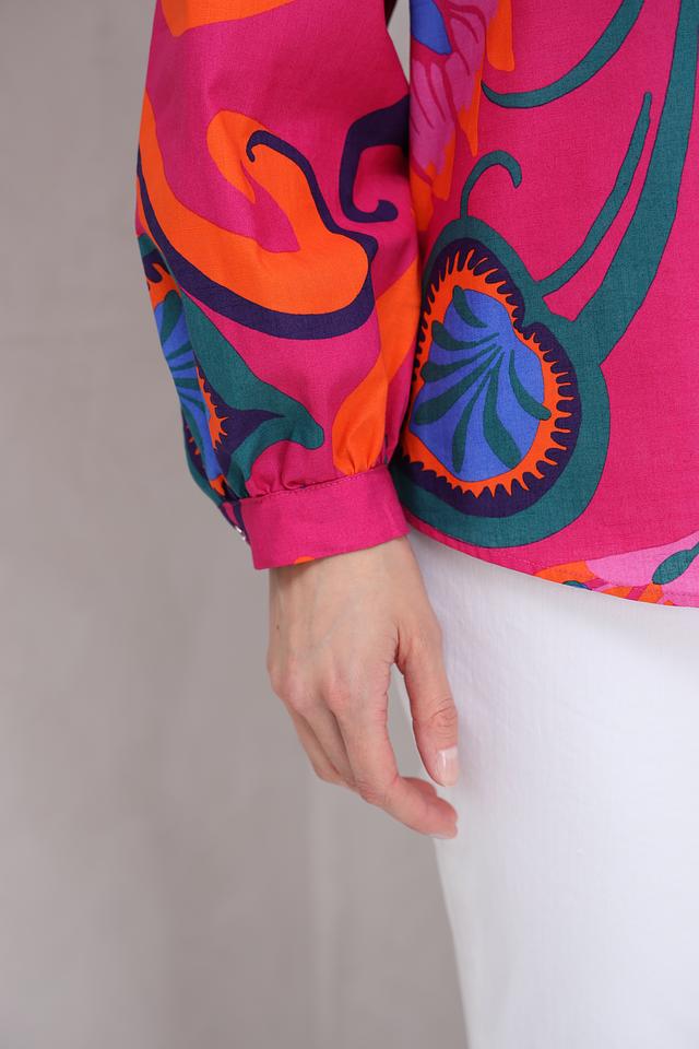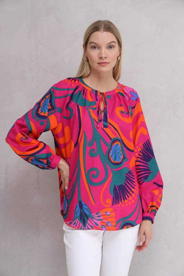 Особенностью данной модели является эффектный цветочный принт в ярких оттенках фуксии, оранжевого, зелёного и синего. Эта блуза идеально подойдет для создания как повседневных, так и праздничных образов. Она прекрасно сочетается с белыми брюками, джинсами или юбками.