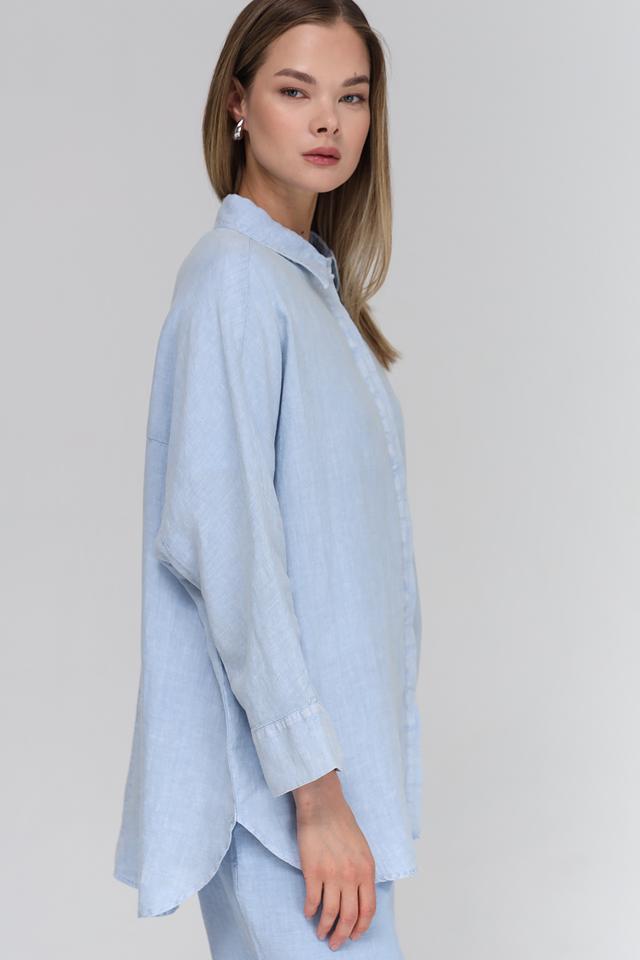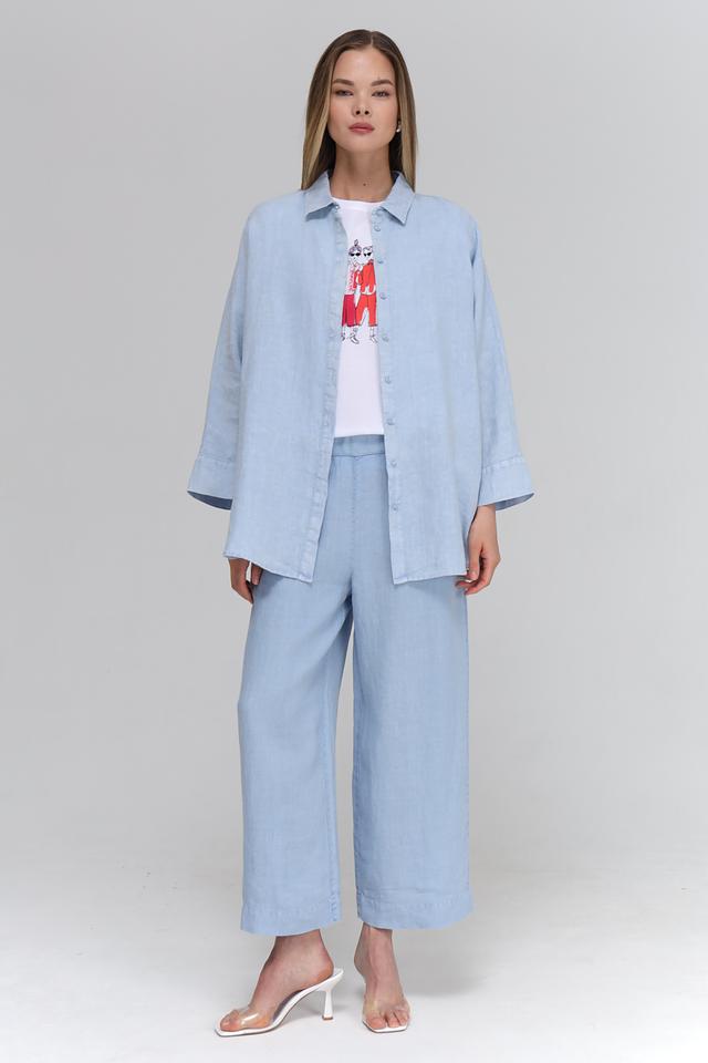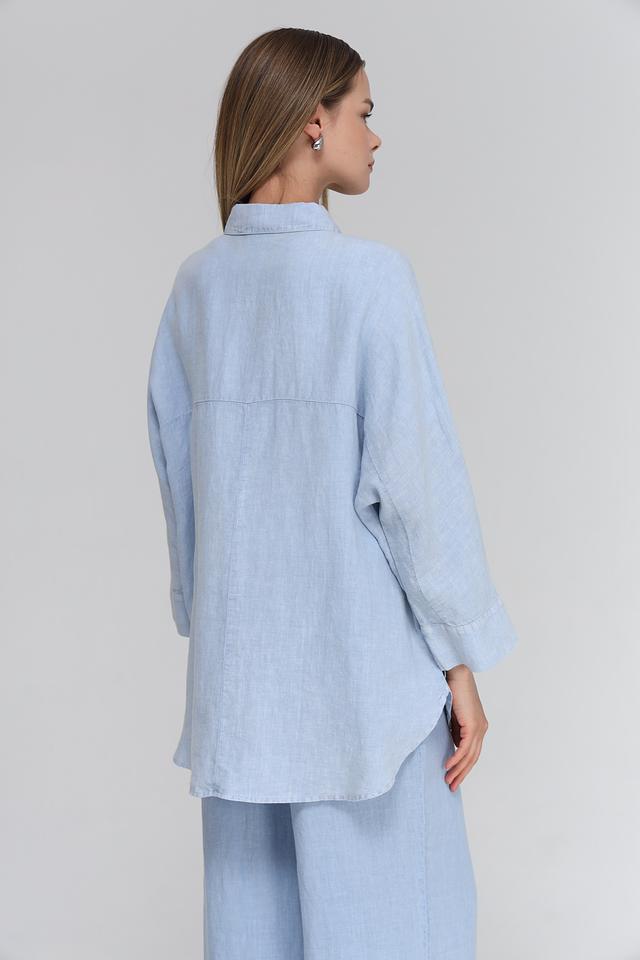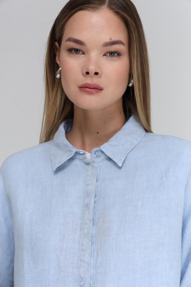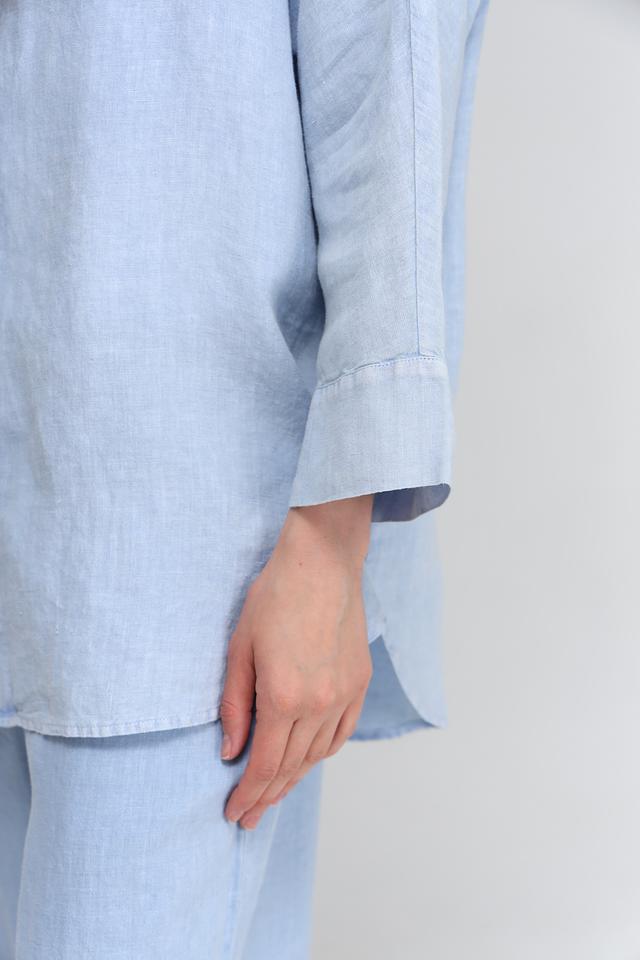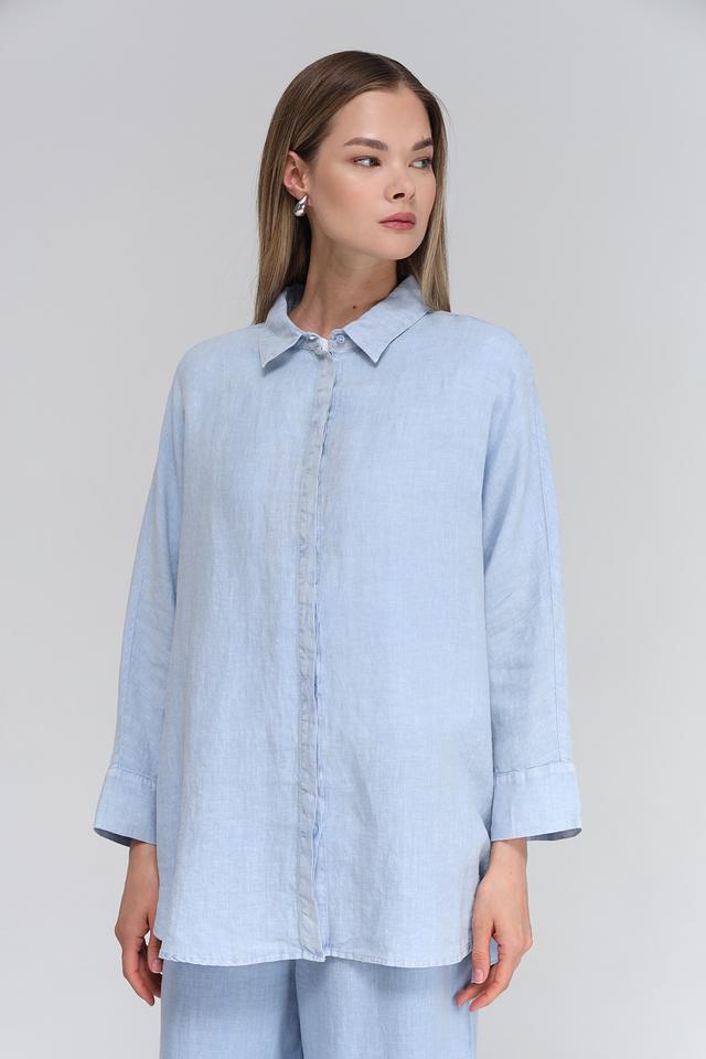 Цвет блузы – нежный голубой, который легко сочетается с различными элементами гардероба. Длинные рукава с манжетами можно закатать для создания более непринуждённого стиля. Эта блуза станет отличной базовой вещью в вашем гардеробе, которую можно носить как с брюками, так и с юбками.