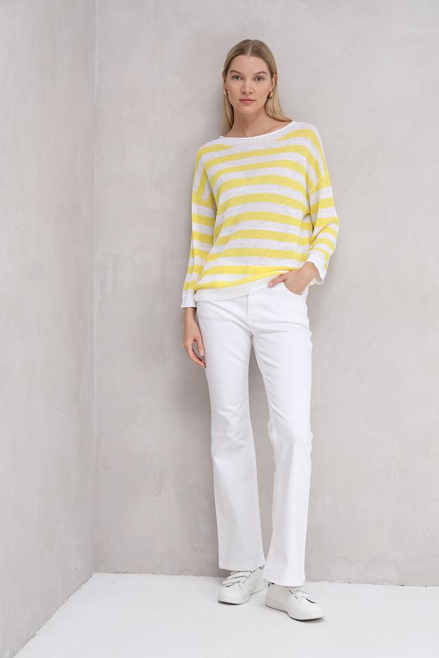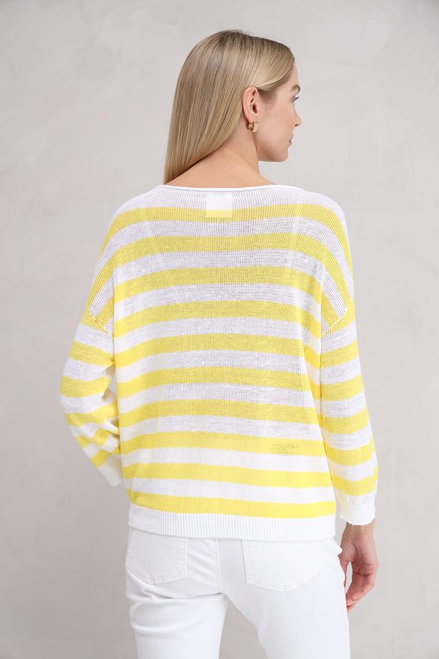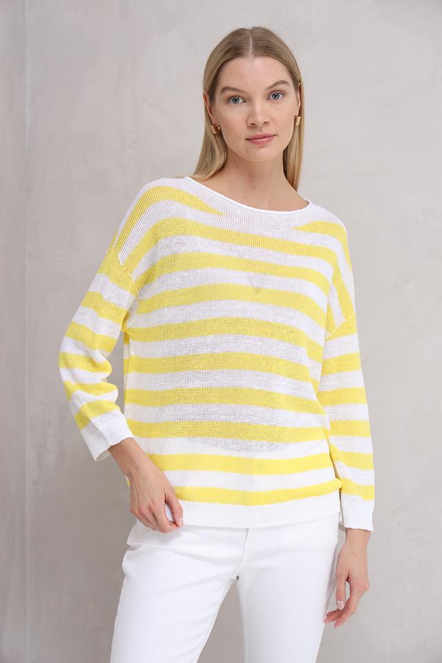 Пуловер украшен горизонтальной полоской в жёлтых и белых тонах, что придаёт ему свежий и летний вид. Текстура полотна лёгкая и воздушная, что делает этот пуловер идеальным выбором для тёплой погоды.