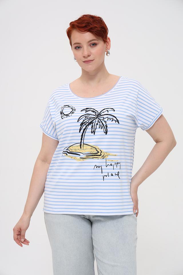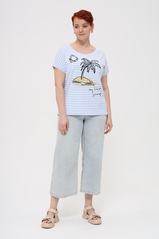 Основной цвет футболки – голубой, дополненный белыми полосками. Главная деталь дизайна – яркий принт с изображением пальмы, солнца и надписью "my happy place". Принт выполнен в графичном стиле и добавляет образу легкости и непринужденности.