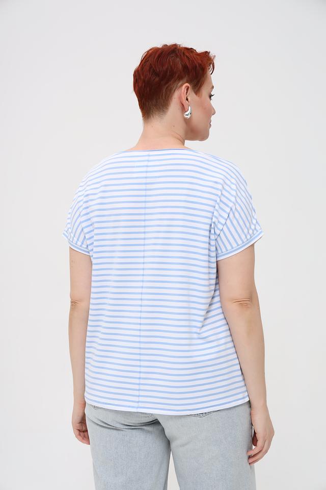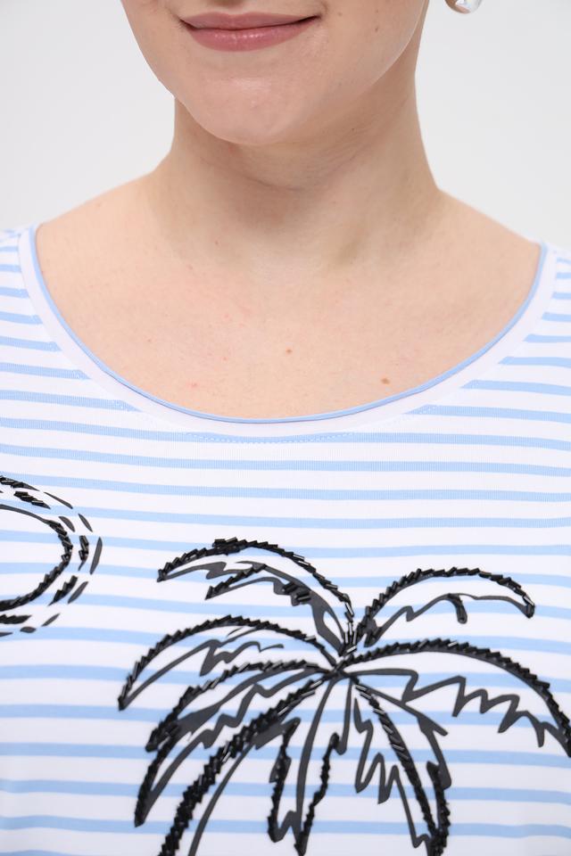 Женская футболка Oui голубого цвета в белую полоску с ярким тропическим принтом. Модель выполнена из мягкого и приятного к телу сочетания хлопка, модала и эластана, обеспечивающего комфорт при носке. Состав: хлопок 47%, модал 47%, эластан 6%