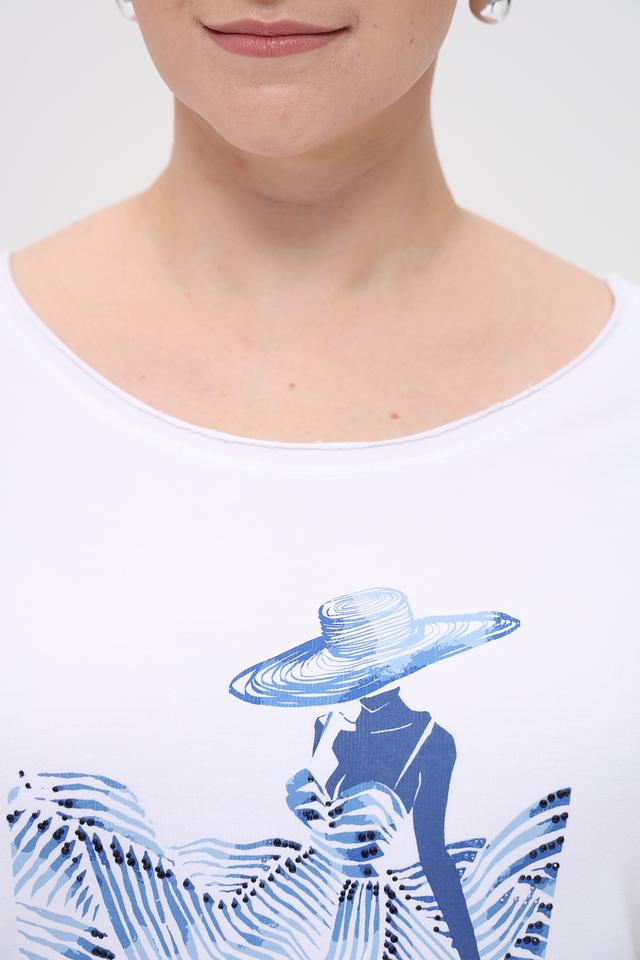 Эта стильная футболка от бренда Oui станет отличным дополнением к вашему гардеробу. Футболка выполнена в белом цвете и украшена ярким принтом, изображающим женщину в шляпе на фоне стилизованных волн.
