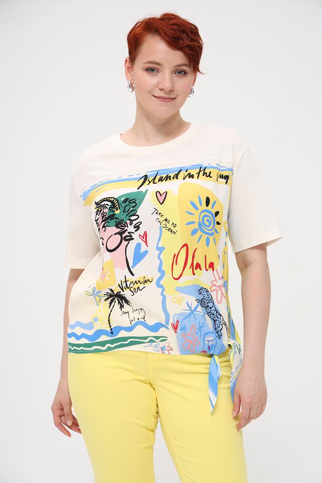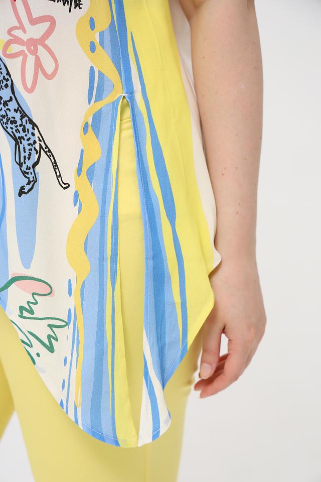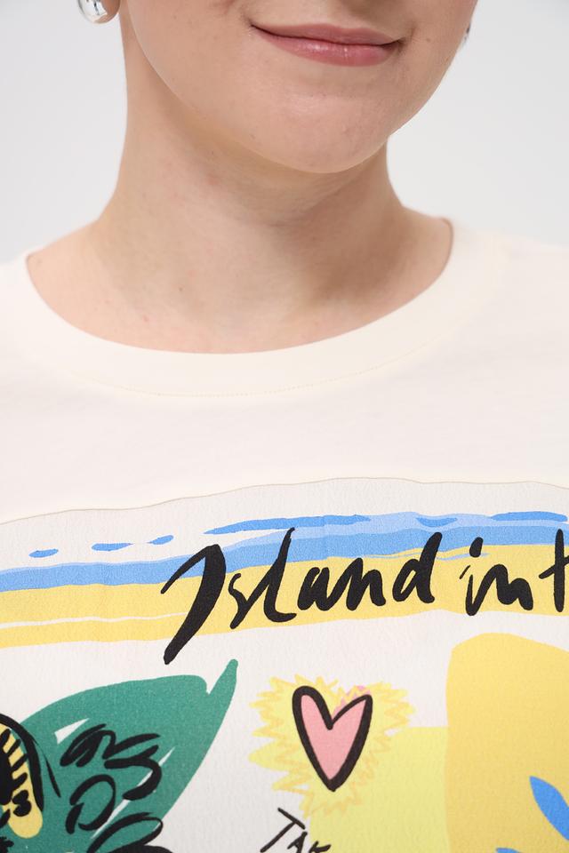 Эта блуза от бренда Oui – идеальный выбор для создания яркого и стильного образа. Выполнена в кремовом цвете и украшена красочным принтом с изображением тропических растений, солнца и морских волн.