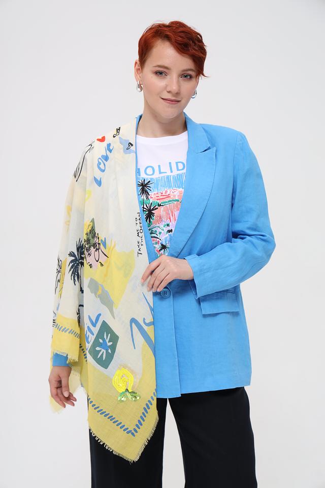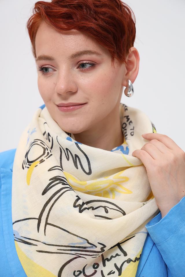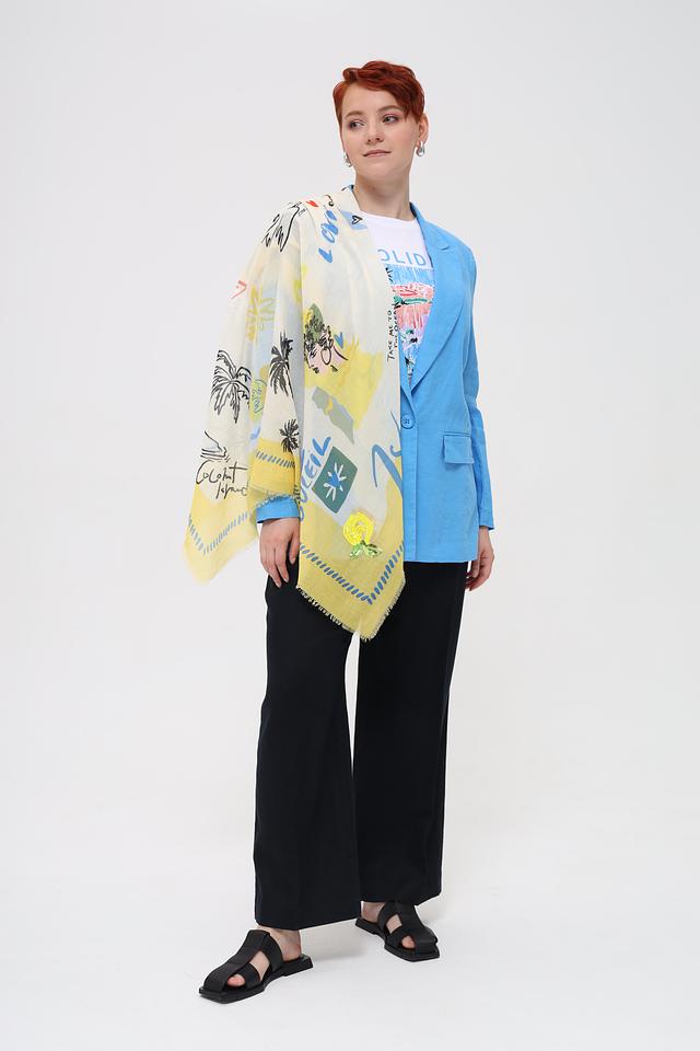 Этот стильный платок от бренда Oui станет ярким акцентом в вашем гардеробе. Он выполнен в нежном жёлтом цвете и украшен оригинальным принтом с изображением пальм, надписей и других летних мотивов.