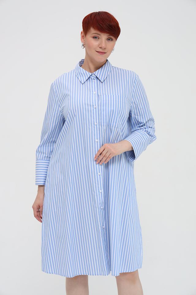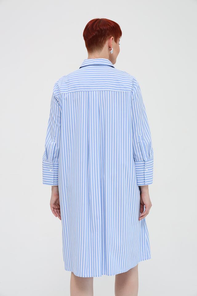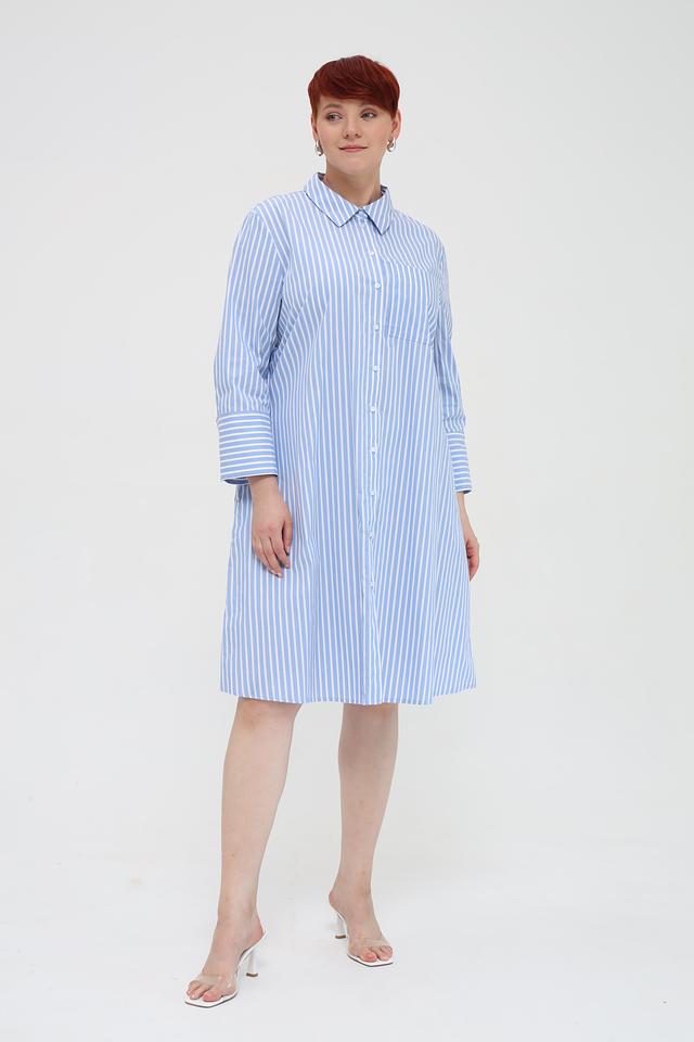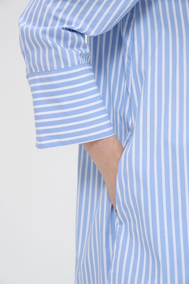 Платье от Oui голубого цвета в классическую полоску. Модель выполнена в стиле рубашки с воротником и застёжкой на пуговицы, имеет рукава 3/4 и боковой карман. Идеальный выбор для создания повседневного образа. Состав: хлопок 100%