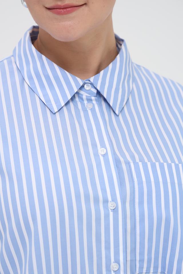 Модель выполнена в стиле рубашки с отложным воротником и застежкой на пуговицы по всей длине. Рукава длиной 3/4 дополнены манжетами на пуговицах. На груди расположен накладной карман, добавляющий практичности и непринужденности образу.