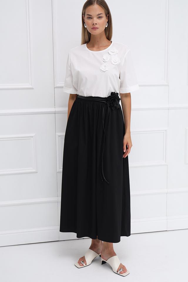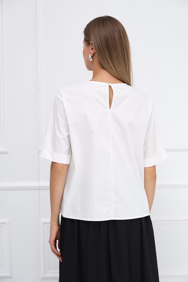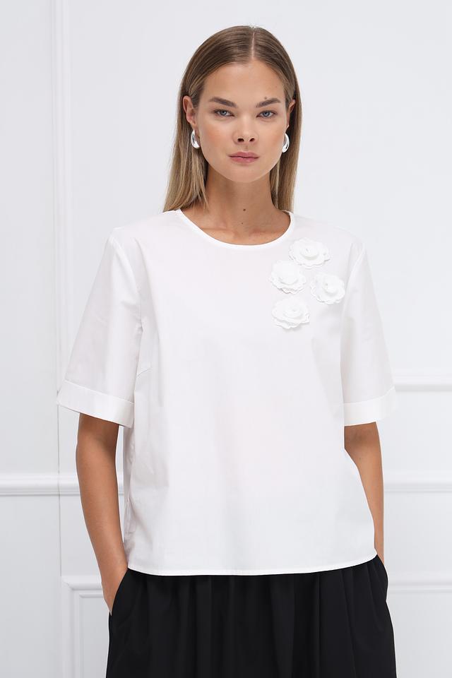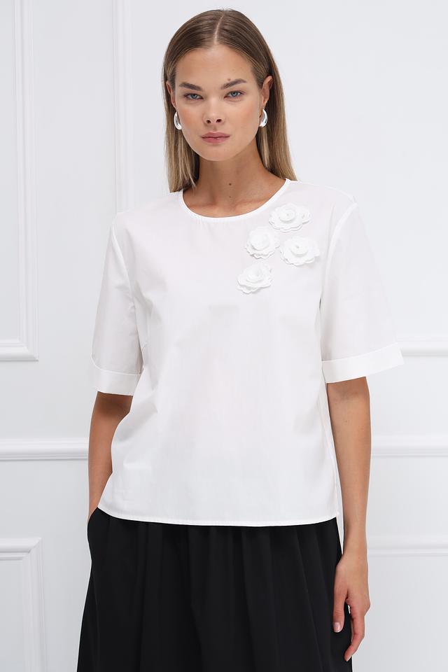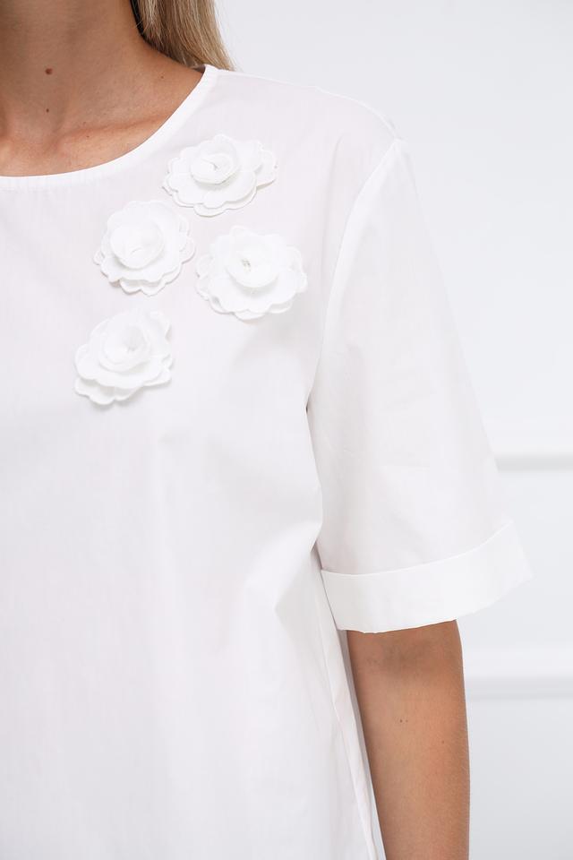 Особенностью модели являются декоративные объемные розы, расположенные на передней части блузы, придающие ей романтичный и женственный вид. Блуза имеет короткий рукав и округлый вырез горловины, что делает ее универсальной для различных образов.