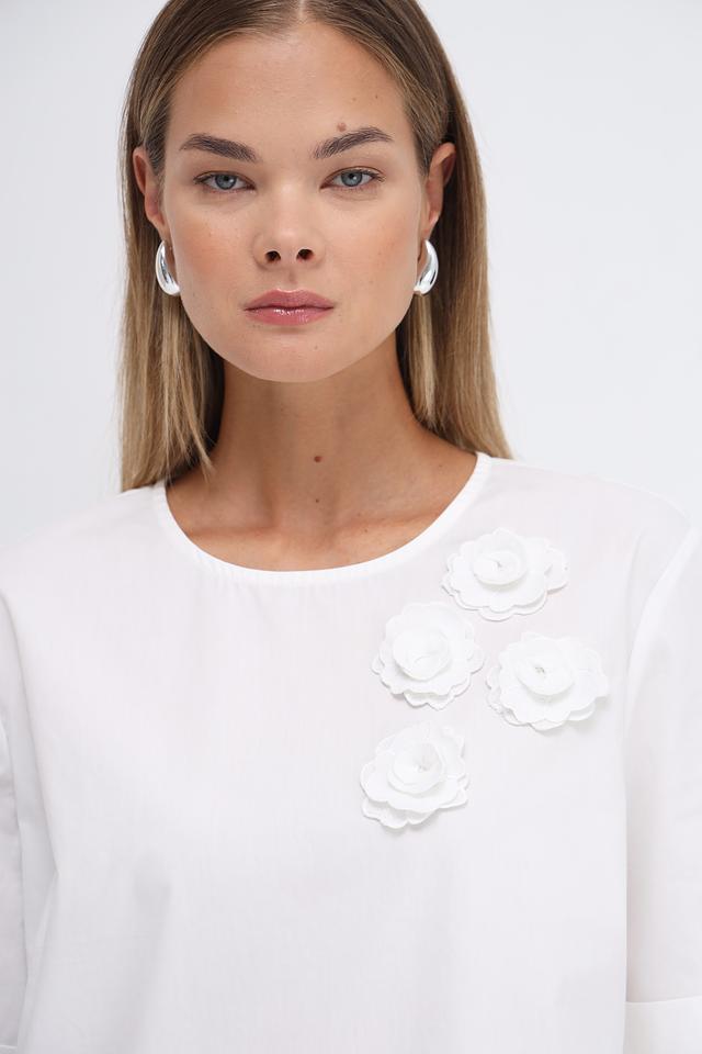 Белая блуза от Oui с декоративными объемными розами. Модель выполнена из 100% хлопка, имеет короткий рукав и округлый вырез горловины. Состав: хлопок 100%