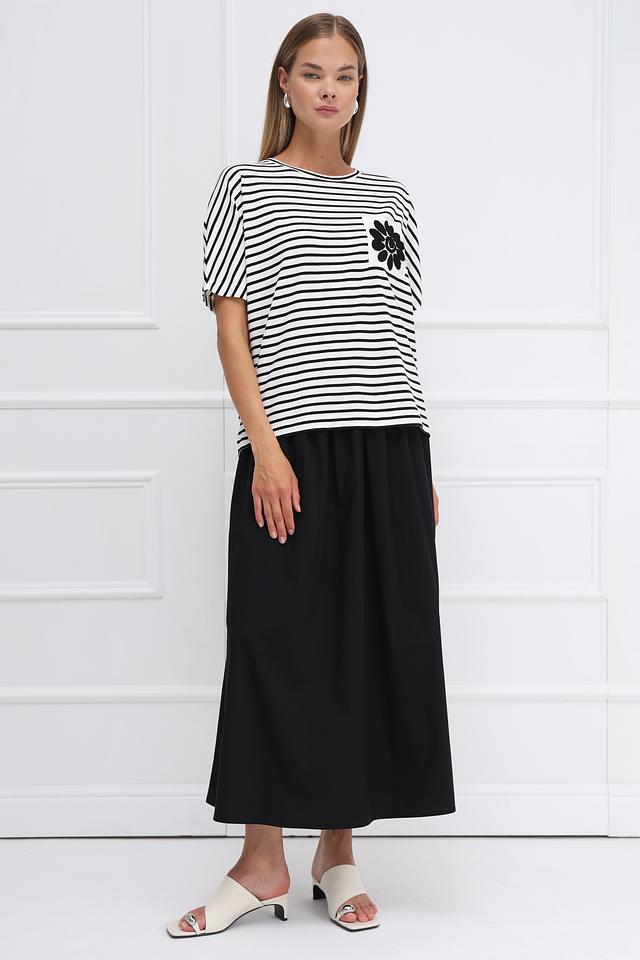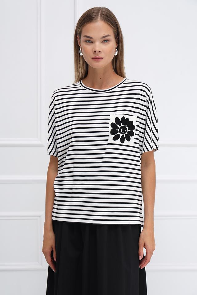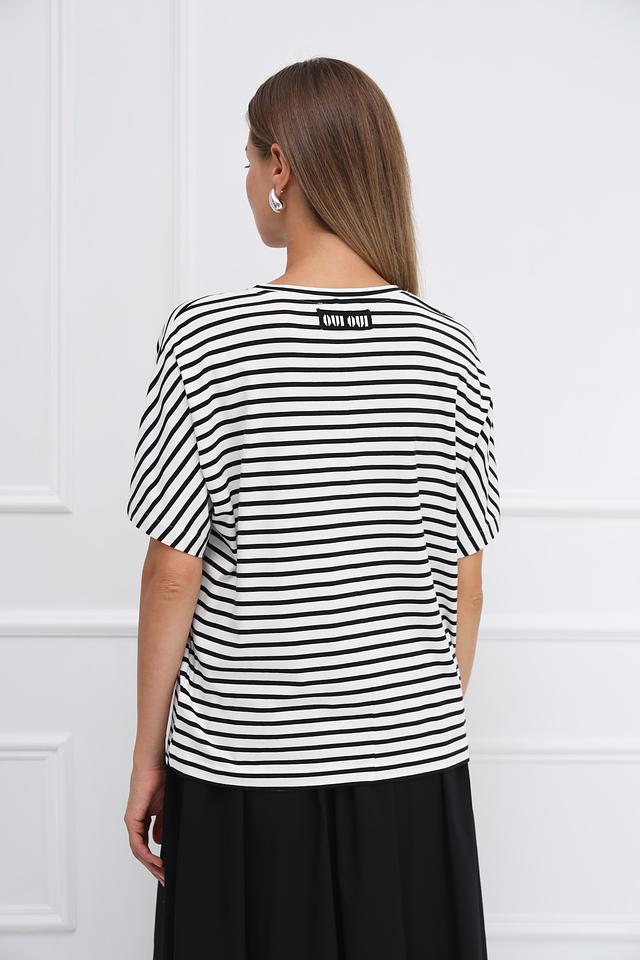 Женская футболка Oui чёрно-белого цвета с коротким рукавом и декоративным цветочным принтом на нагрудном кармане. Изготовлена из мягкого и приятного к телу сочетания хлопка, модала и эластана. Состав: хлопок 47%, модал 47%, эластан 6%
