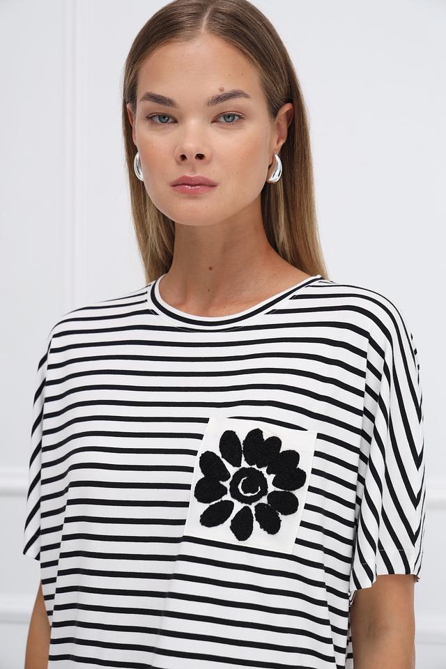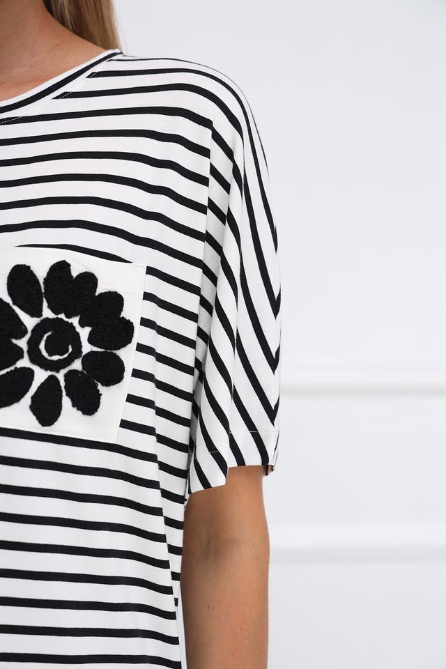Футболка имеет прямой крой, короткие рукава и круглый вырез горловины. Нагрудный карман украшен аппликацией в виде чёрного цветка, что придает ей оригинальность и индивидуальность.