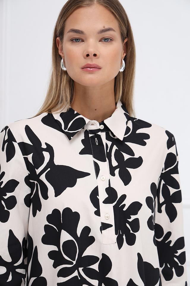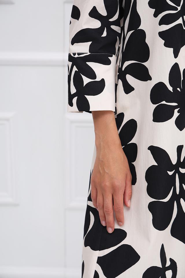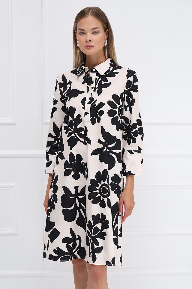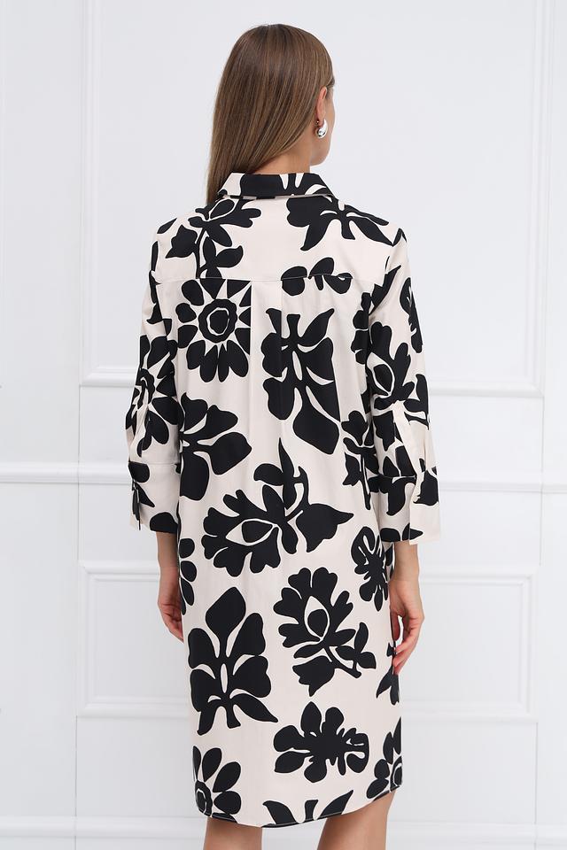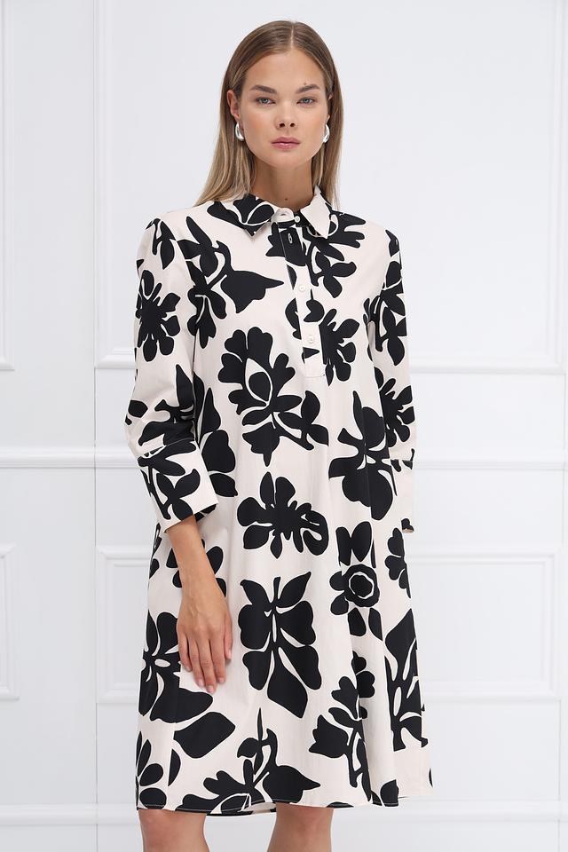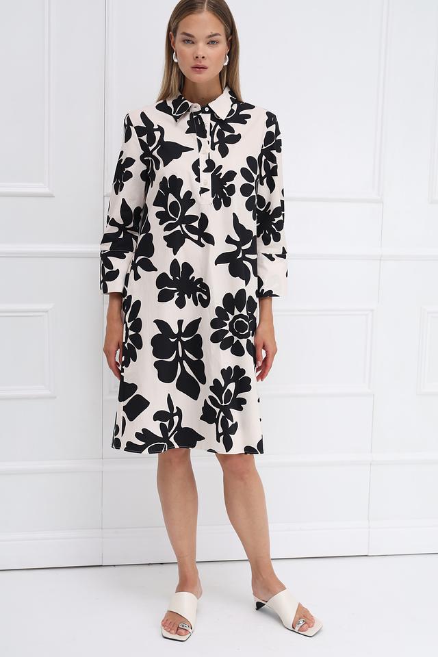 Основной цвет платья – кремовый, а ярким акцентом является крупный чёрный цветочный принт, который придает образу свежесть и оригинальность. Модель имеет воротник-стойку и застёжку на пуговицы по всей длине, что позволяет регулировать степень открытости.