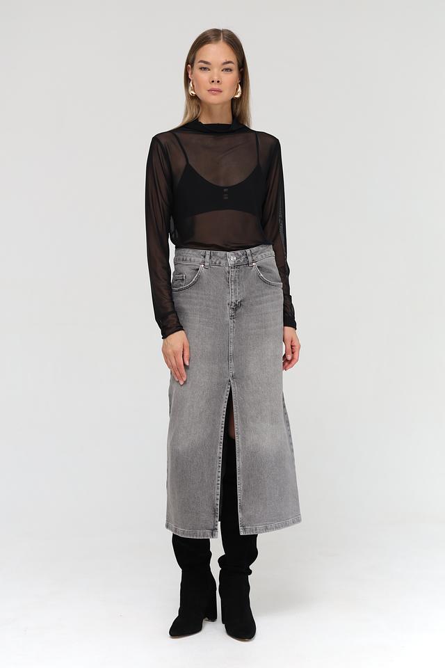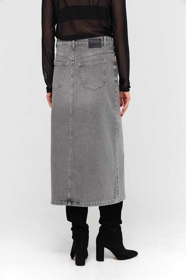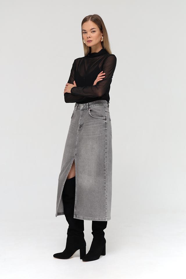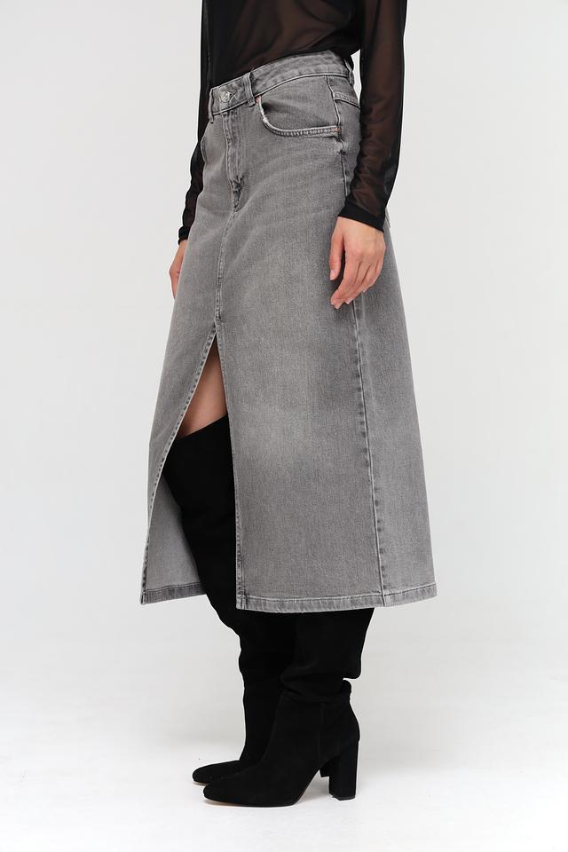 Юбка имеет классический серый цвет и длину миди. Прямой крой и асимметричный разрез спереди придают ей современный и элегантный вид. Модель застегивается на молнию и пуговицу.