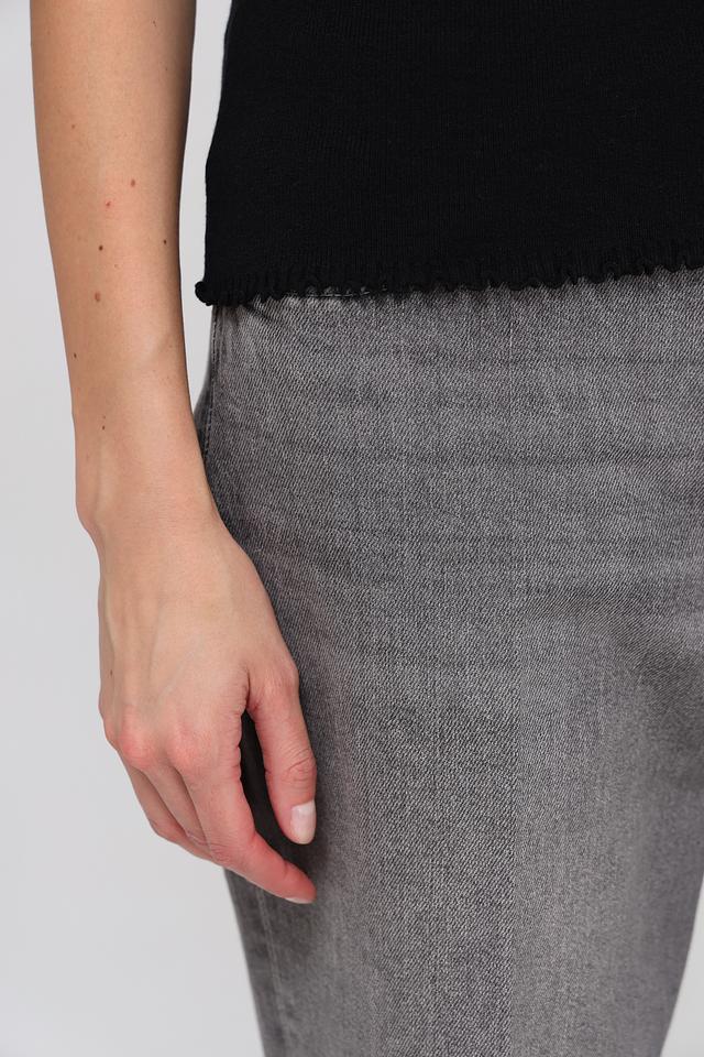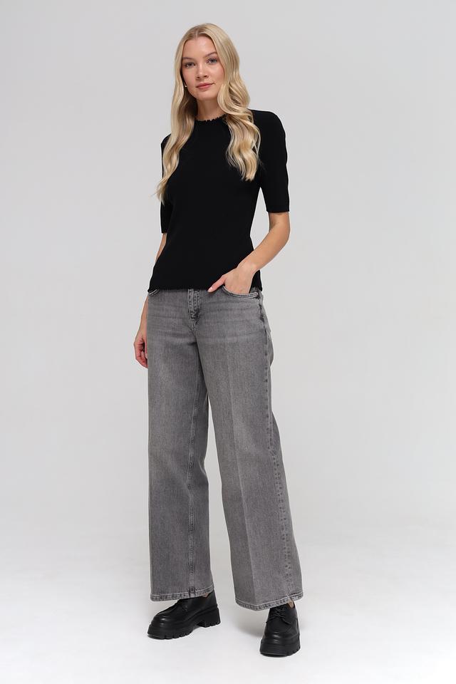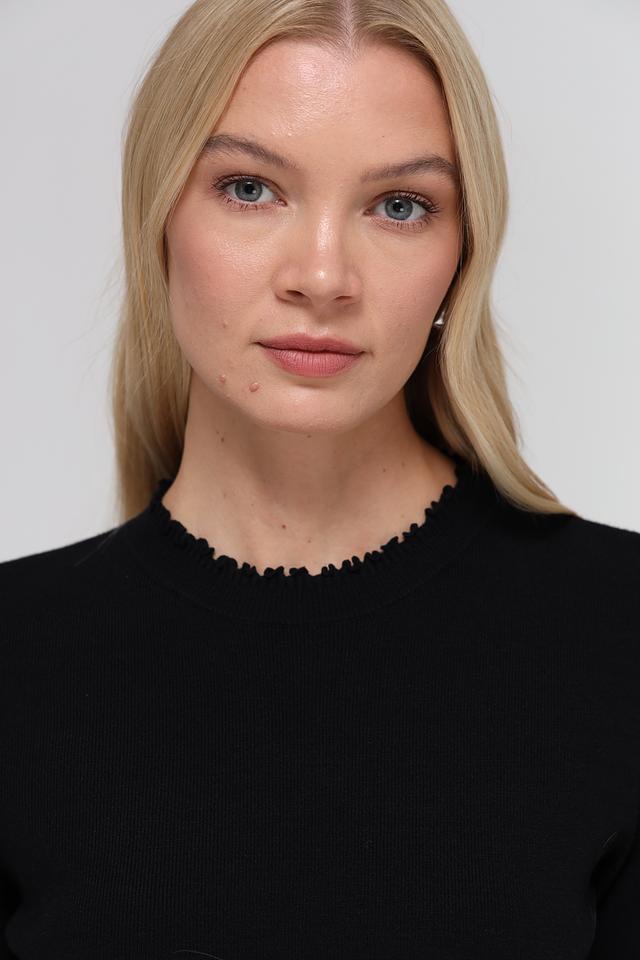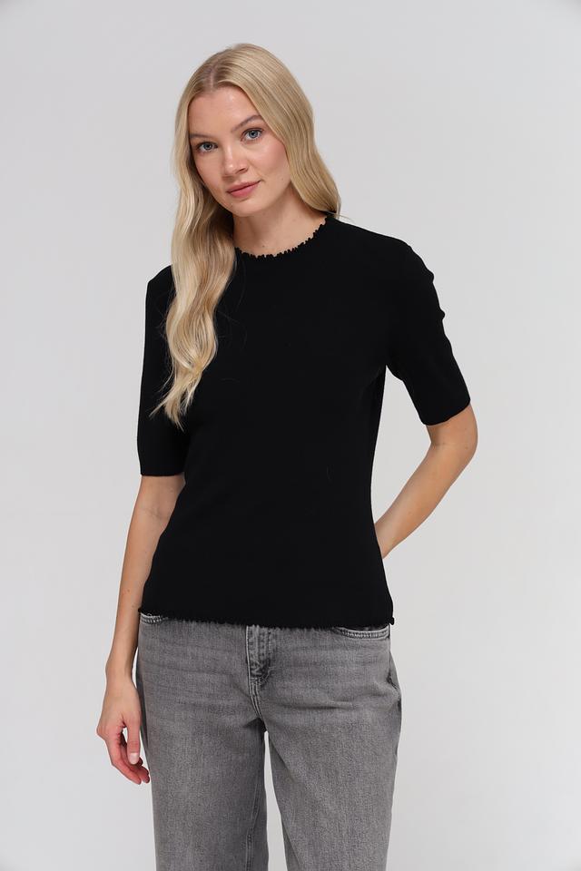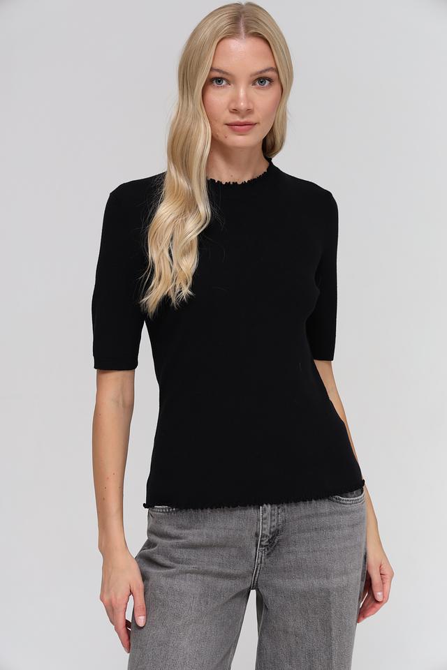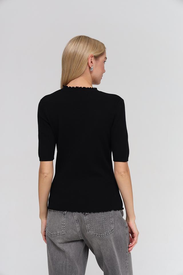 Пуловер имеет короткий рукав и облегающий силуэт, который подчеркивает фигуру. Особый акцент сделан на декоративной отделке горловины – нежная оборка придает изделию женственность и изысканность.