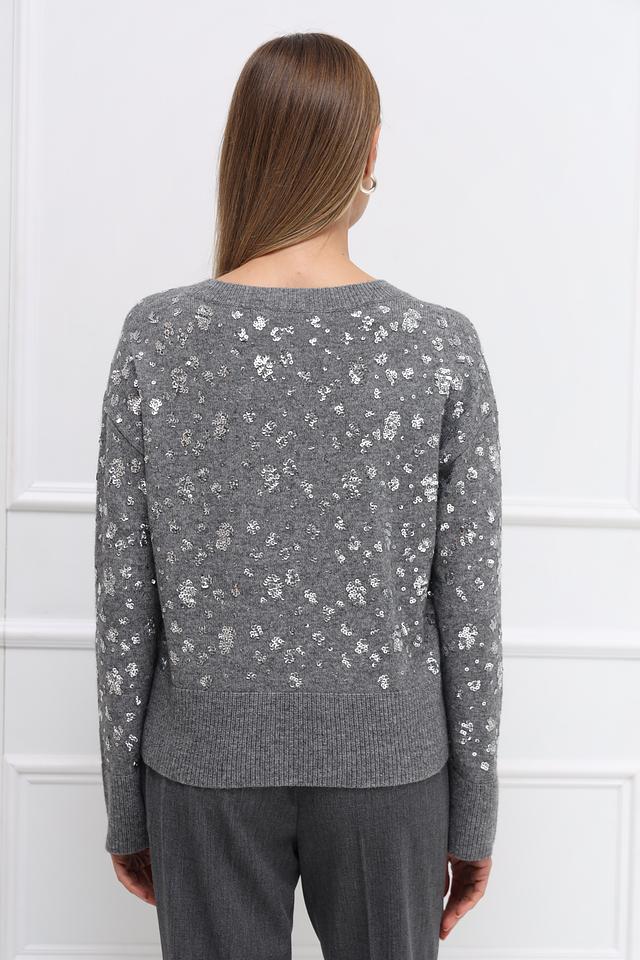 Пуловер отличается оригинальным дизайном благодаря обильной вышивке из серебристых пайеток, которые придают изделию праздничный и нарядный вид. Круглый вырез горловины и классический крой делают этот пуловер универсальным элементом гардероба, который легко сочетается с различными предметами одежды.