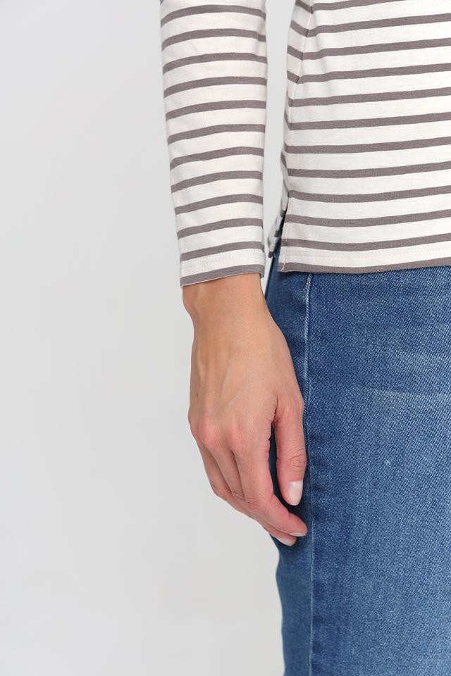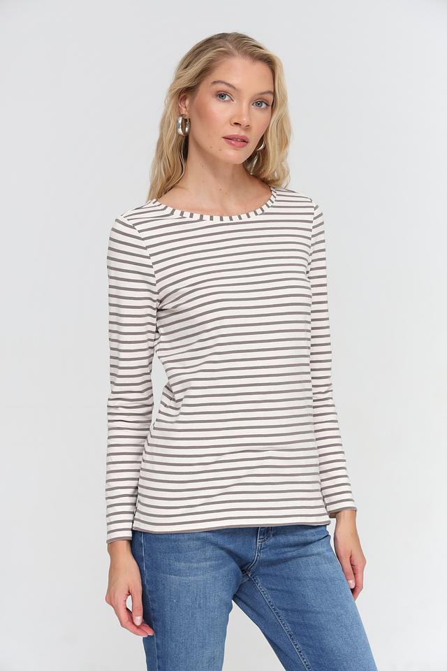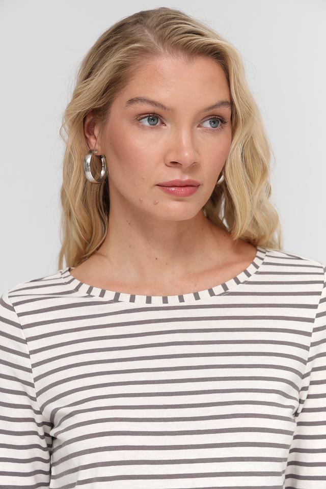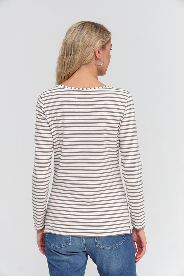 Женская футболка Oui серого цвета с классическим полосатым принтом. Изготовлена из мягкого и приятного к телу сочетания хлопка и модала, обеспечивающего комфорт в носке. Отличный выбор для создания повседневных образов. Состав: хлопок 47%, модал 47%, эластан 6%