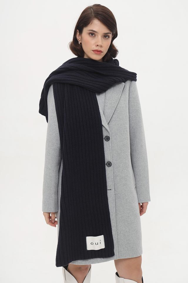 Шарф имеет прямоугольную форму и выполнен из мягкой и приятной на ощупь смеси хлопка и полиакрила. Фактурная вязка придает изделию объем и оригинальность. На одном из концов шарфа расположен небольшой лейбл с логотипом бренда Oui.