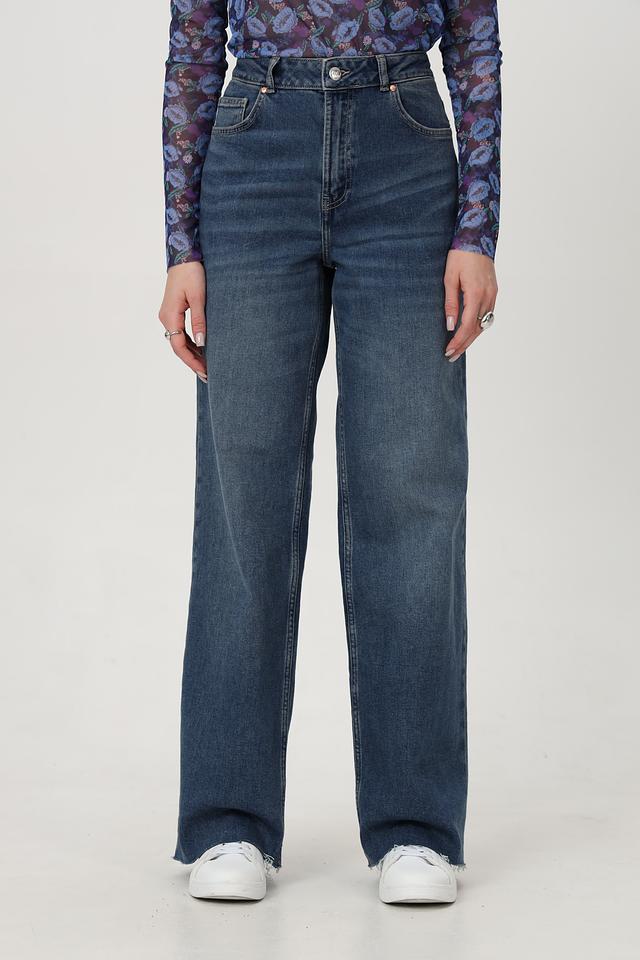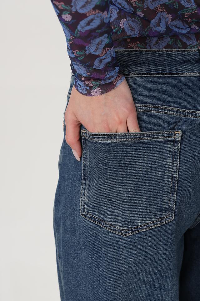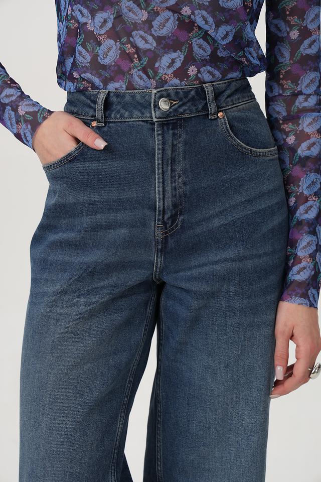 Джинсы имеют высокую посадку и свободный, широкий крой, что делает их отличным выбором для создания расслабленных и стильных образов. Классический синий цвет легко сочетается с различными элементами гардероба.