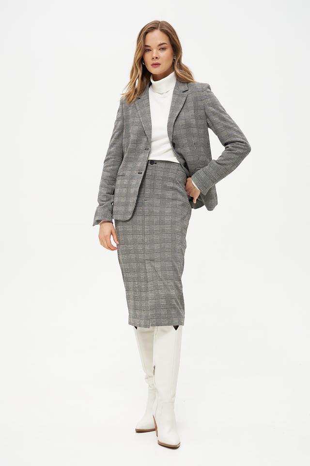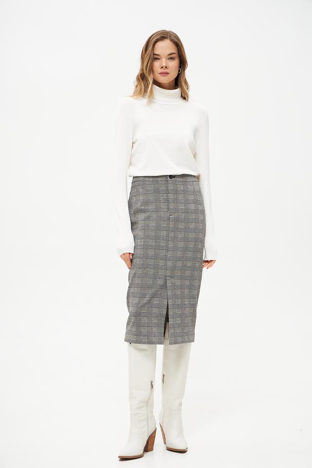 Юбка имеет миди-длину и приталенный силуэт, подчеркивающий фигуру. Сзади предусмотрен небольшой разрез, который добавляет образу динамичности и свободы движений. Застежка – молния с пуговицей.