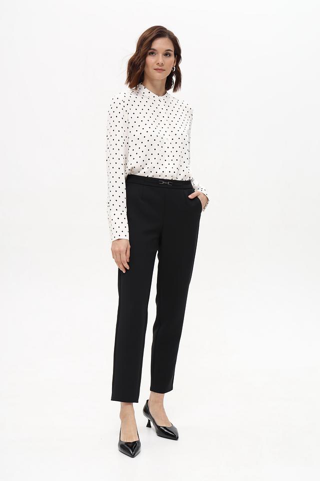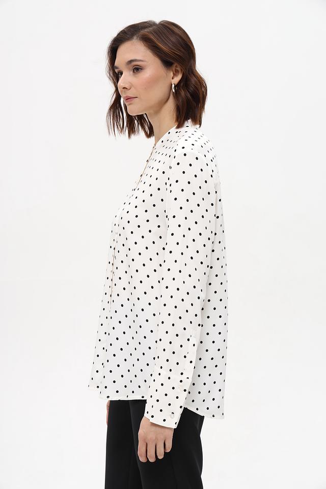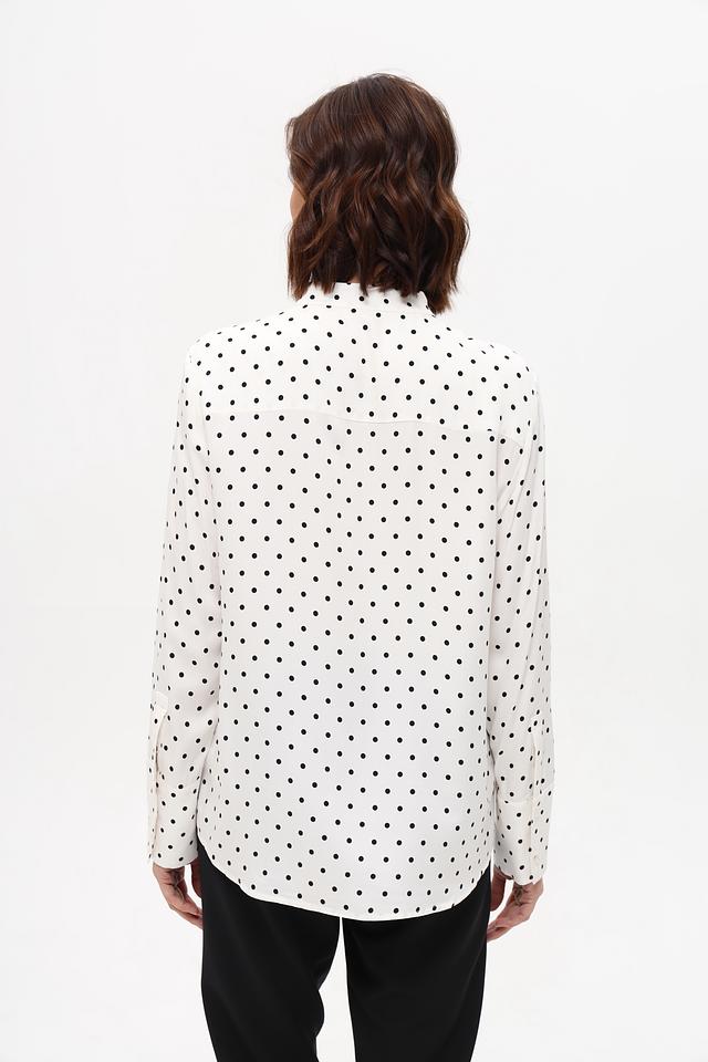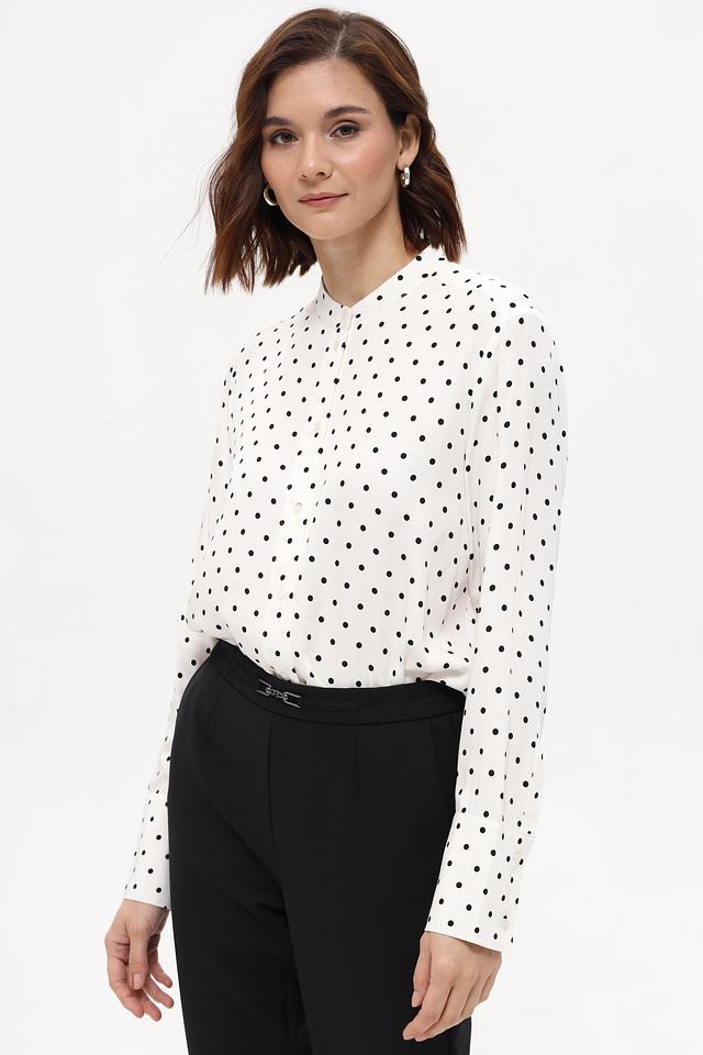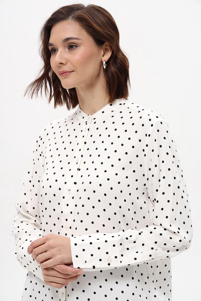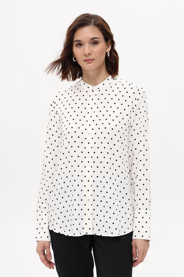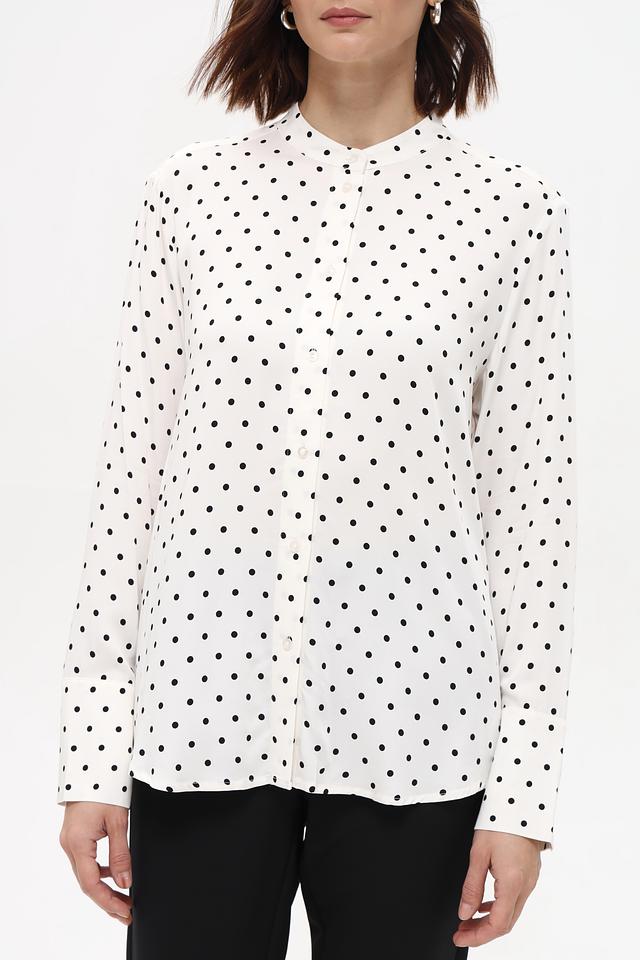 Белая блуза Oui с мелким чёрным горошком выполнена из 100% вискозы. Классический крой и длинные рукава делают эту модель универсальной для создания различных образов. Состав: вискоза 100%