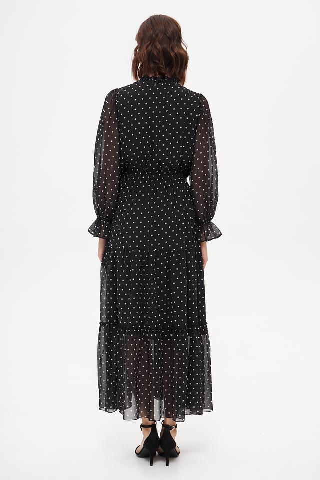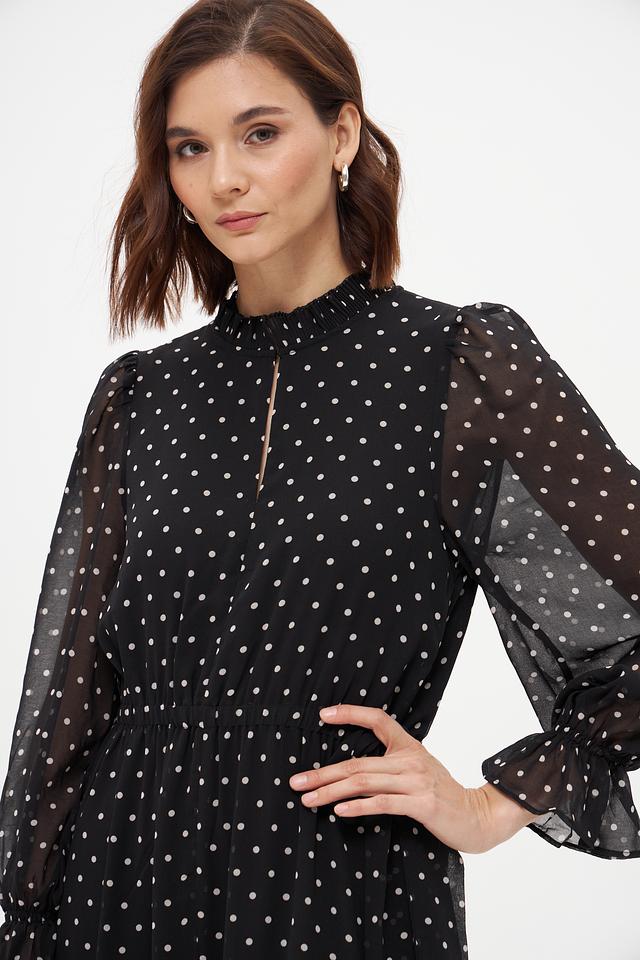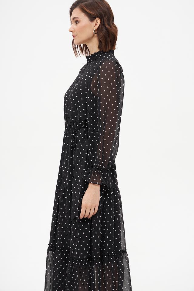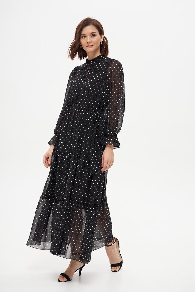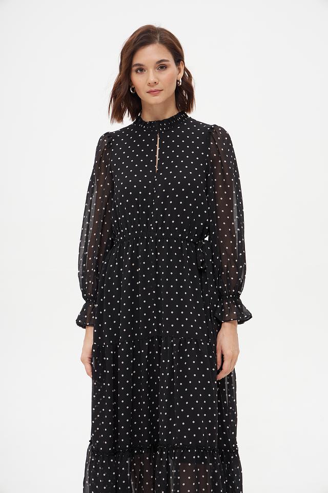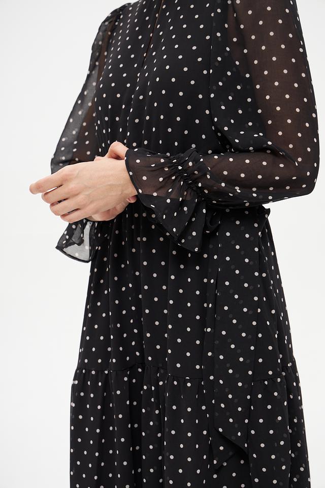 Платье от Oui чёрного цвета, украшенное белым горошком, выполнено из лёгкой полупрозрачной ткани. Модель с длинными рукавами и многоярусной юбкой создаёт романтичный и женственный образ. Состав: полиэстер 100%