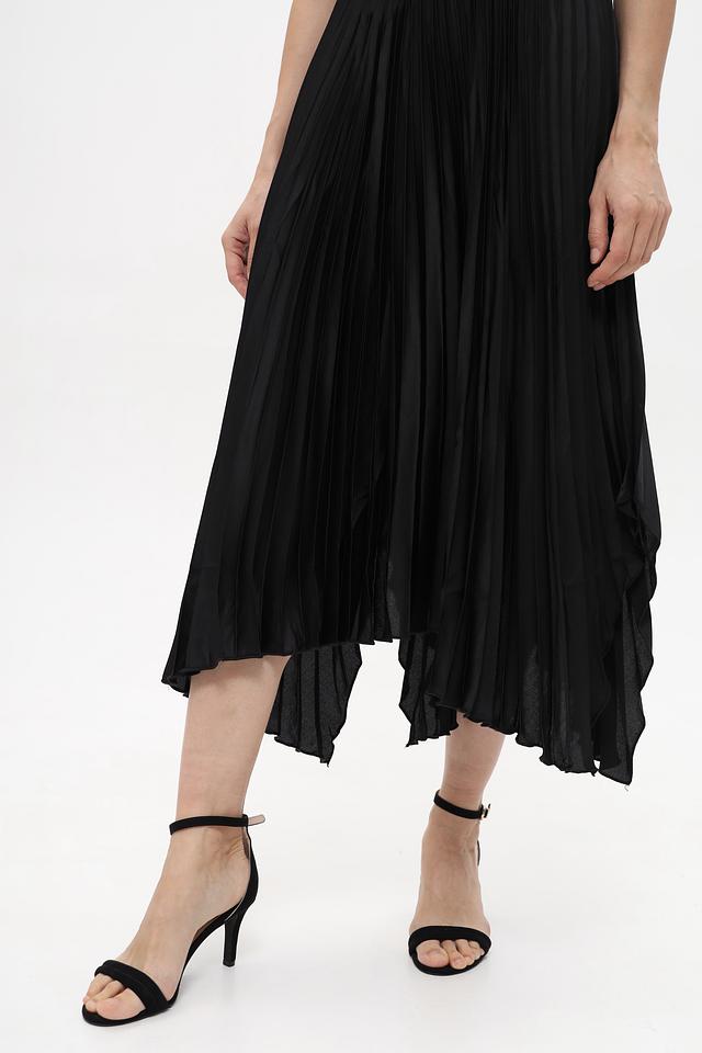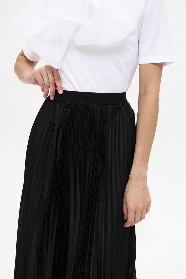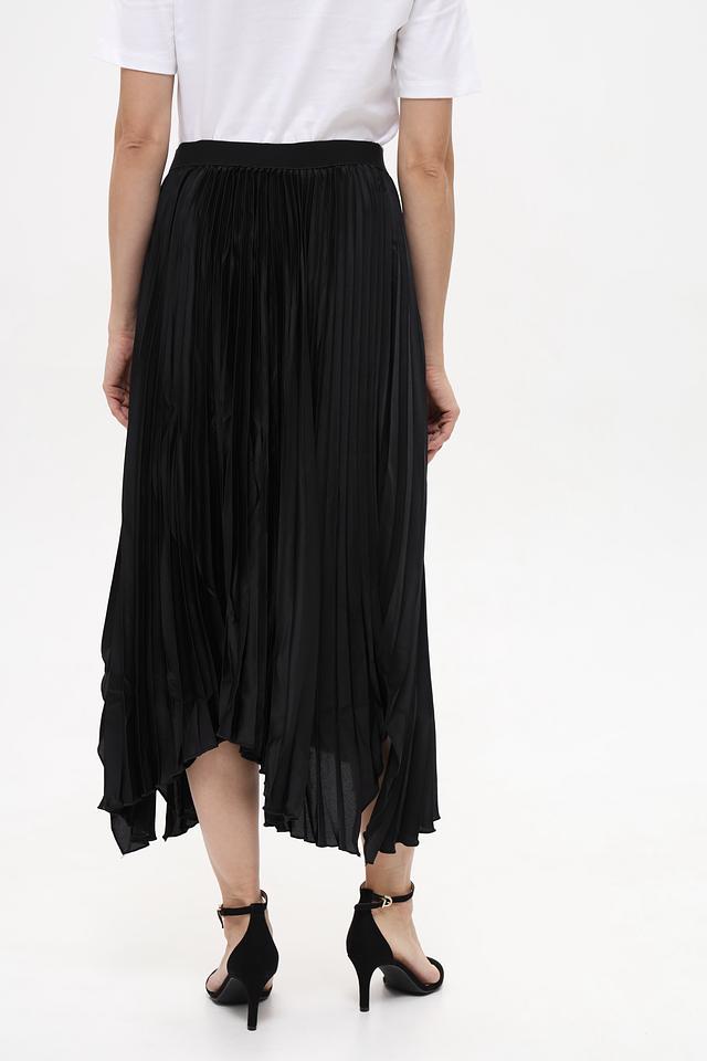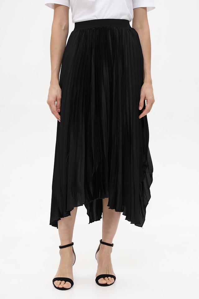 Чёрная юбка плиссе от Oui выполнена из полиэстера с добавлением эластана. Модель имеет эластичный пояс и асимметричный подол, что придает ей современный вид. Состав: полиэстер 97%, эластан 3%