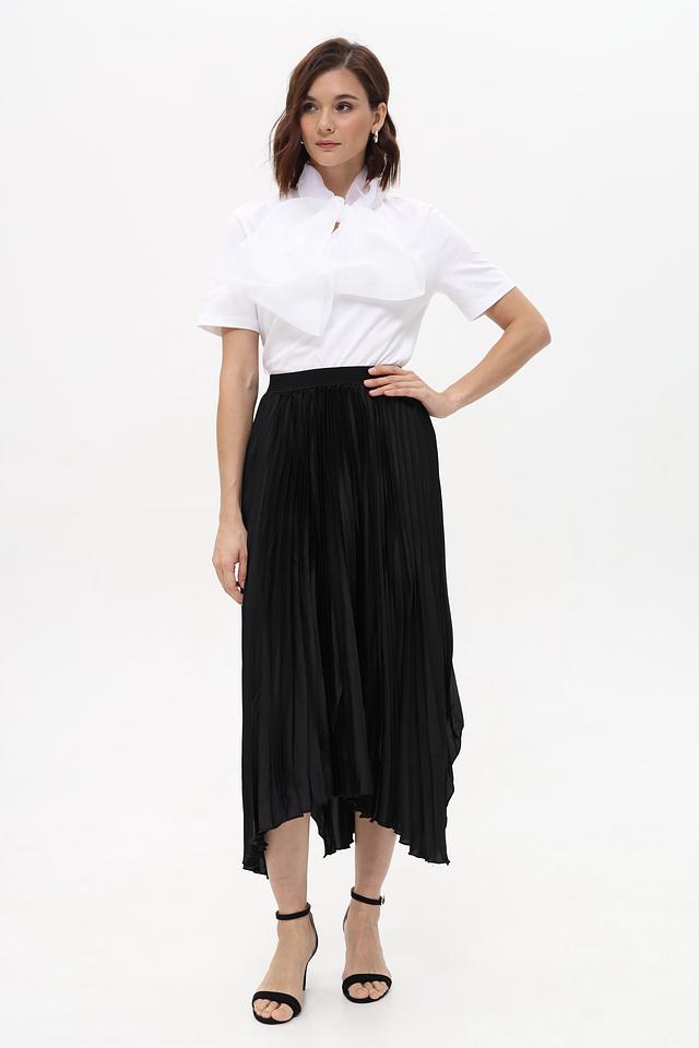 Юбка имеет плиссированную текстуру, которая придает ей лёгкость и динамичность. Эластичный пояс обеспечивает комфортную посадку по фигуре. Асимметричный подол добавляет образу оригинальности и современности.