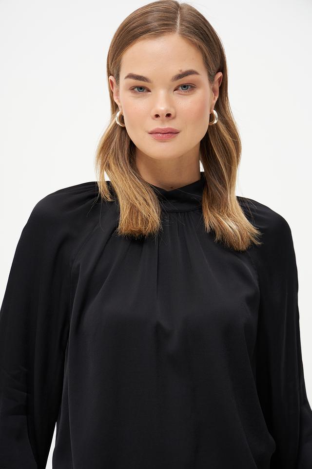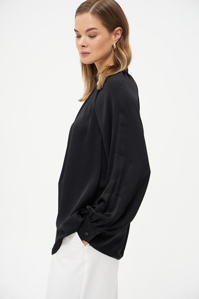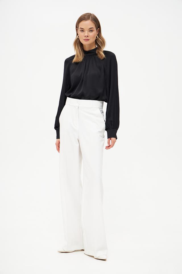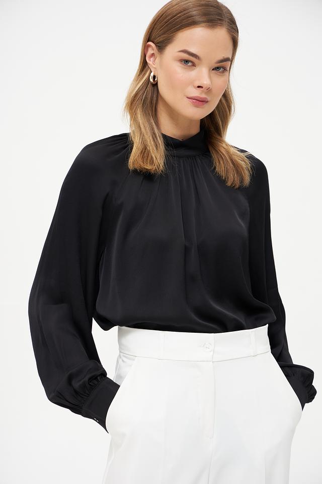 Блуза имеет классический чёрный цвет, который легко сочетается с различными элементами одежды. Воротник-стойка придает образу элегантность и изысканность. Длинные рукава с манжетами добавляют завершенности силуэту.