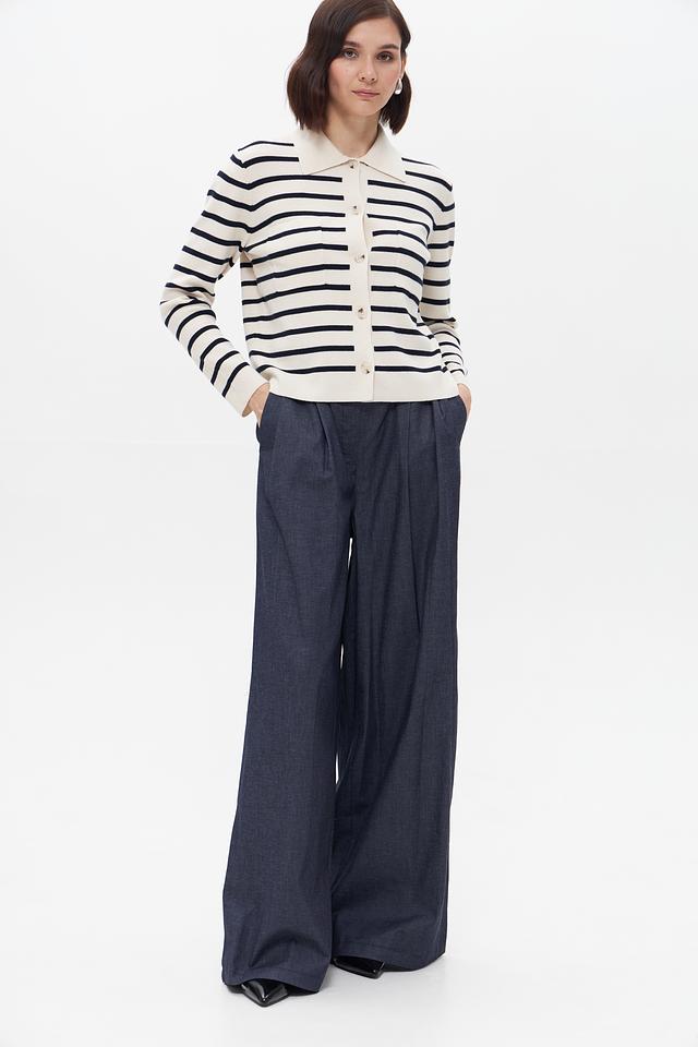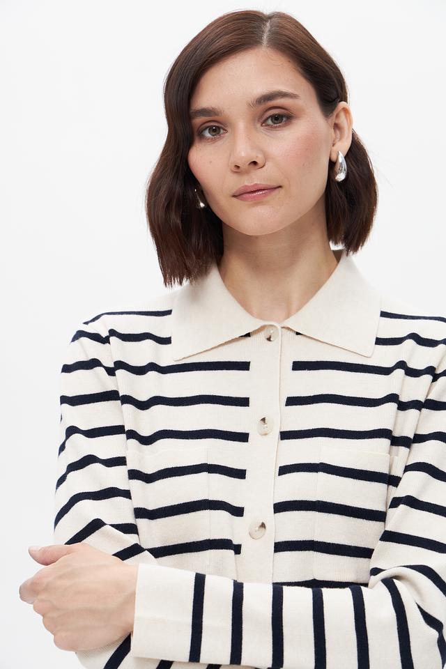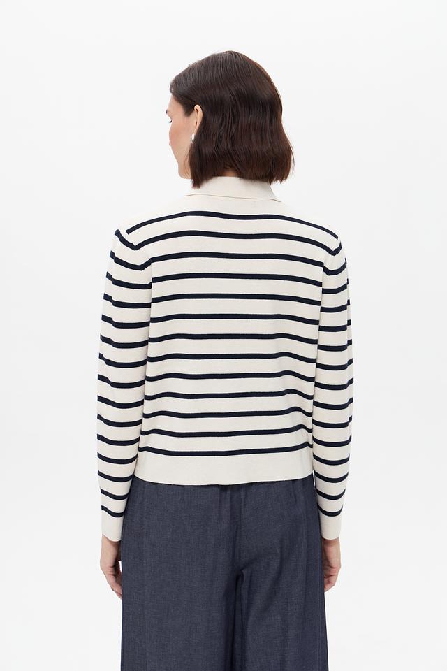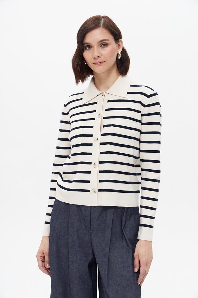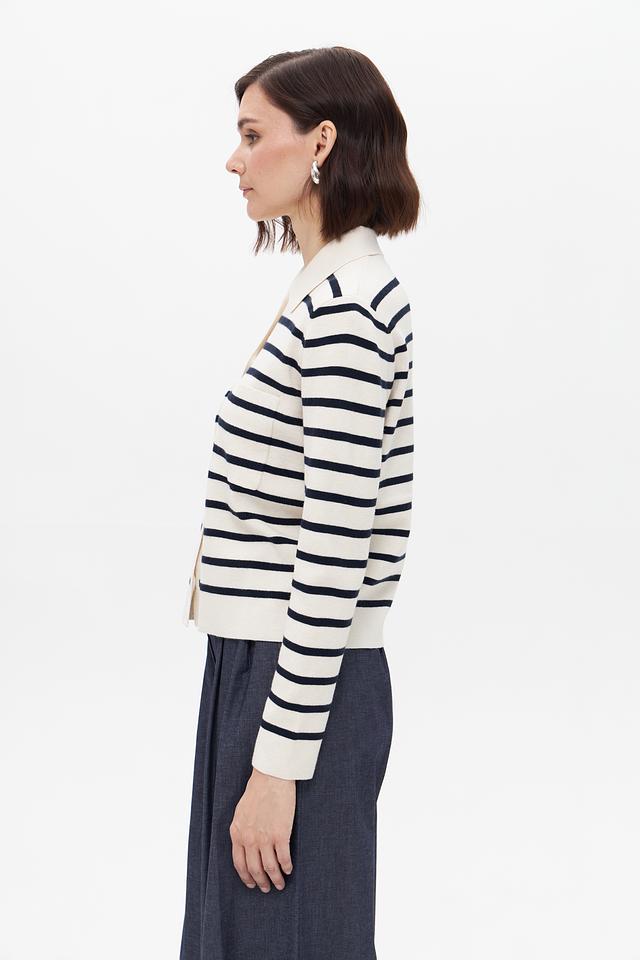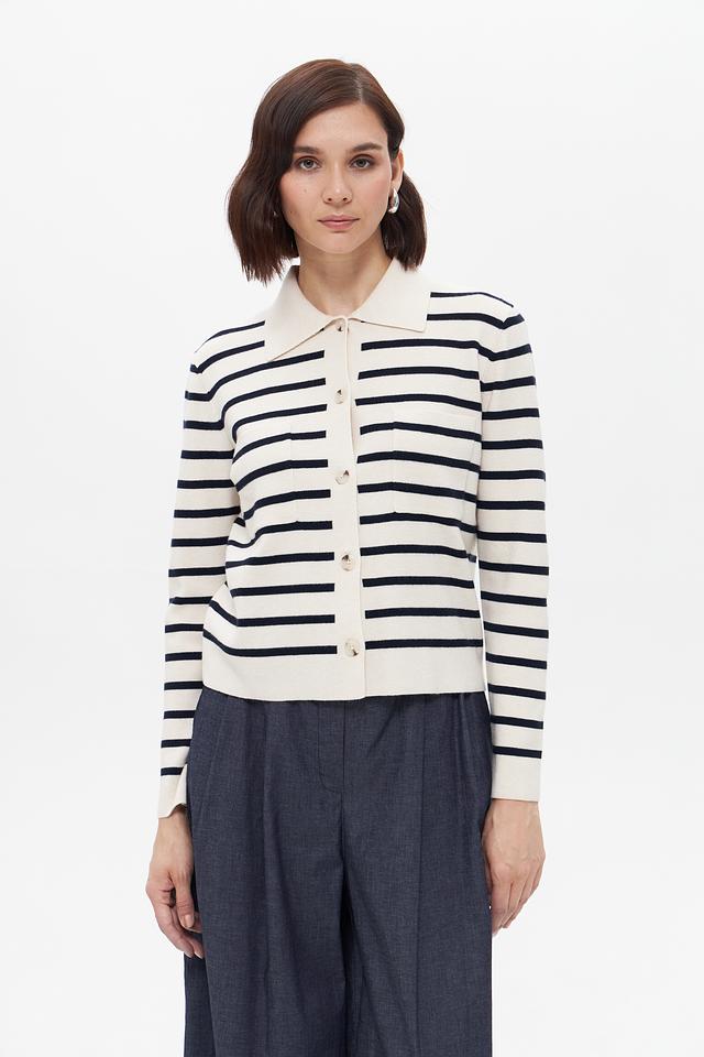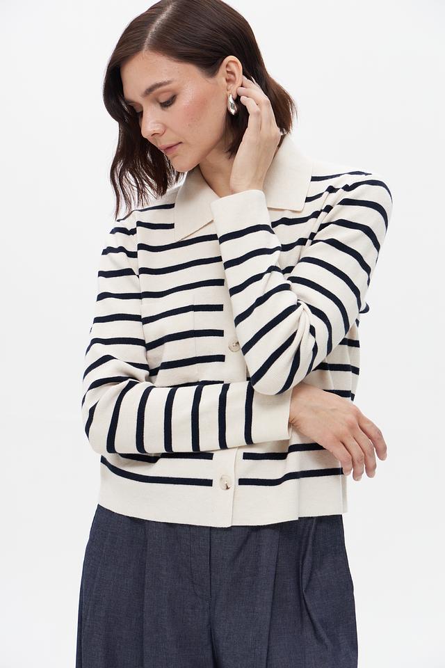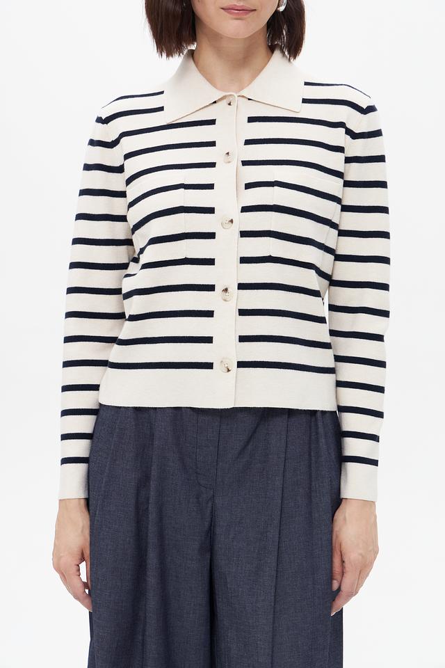 Этот стильный жакет от бренда Oui выполнен в классическом дизайне с полосатым узором. Преобладающий цвет – бежевый, с контрастными тёмно-синими полосами, создающими эффектный визуальный акцент.