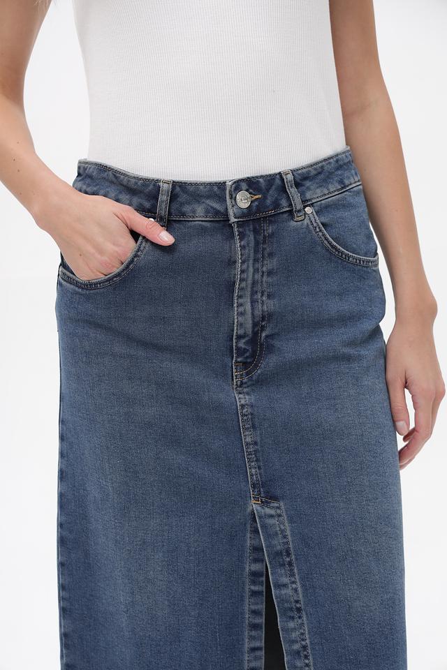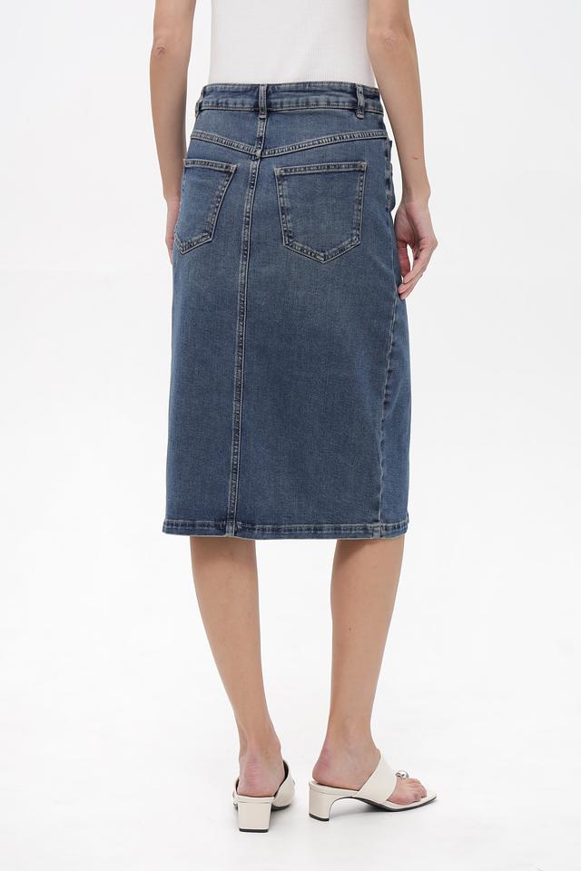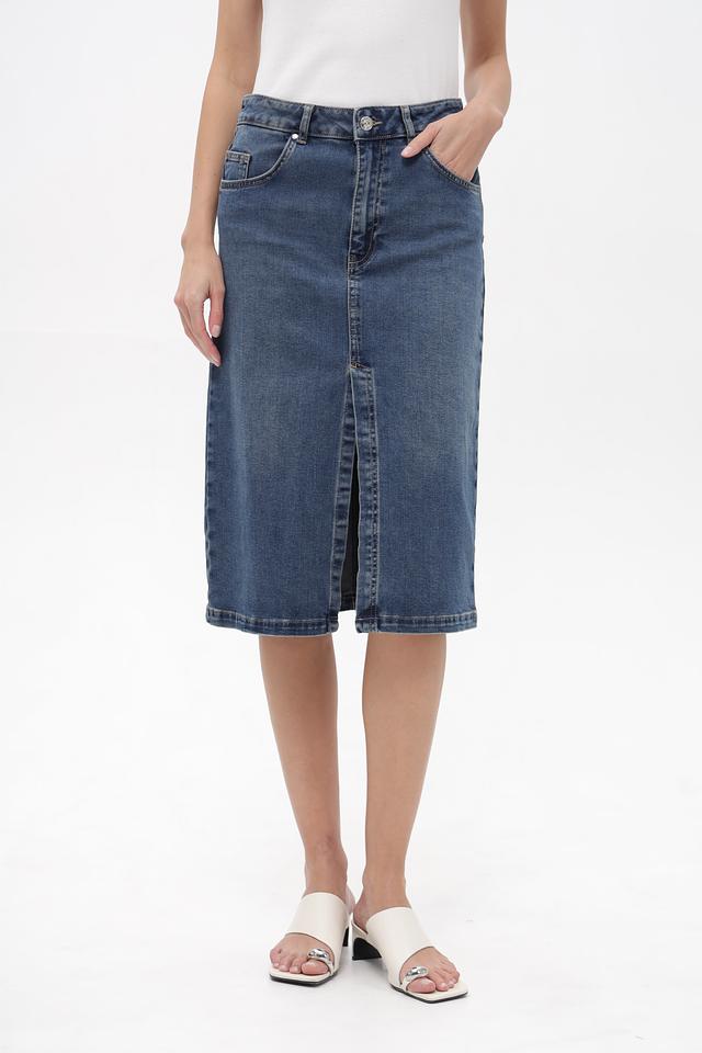 Юбка имеет классический синий цвет и высокую посадку, подчеркивающую талию. Оригинальный разрез спереди добавляет образу динамичности и современности. Пять карманов – два спереди и два сзади – обеспечивают функциональность.