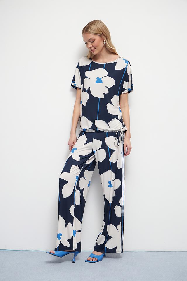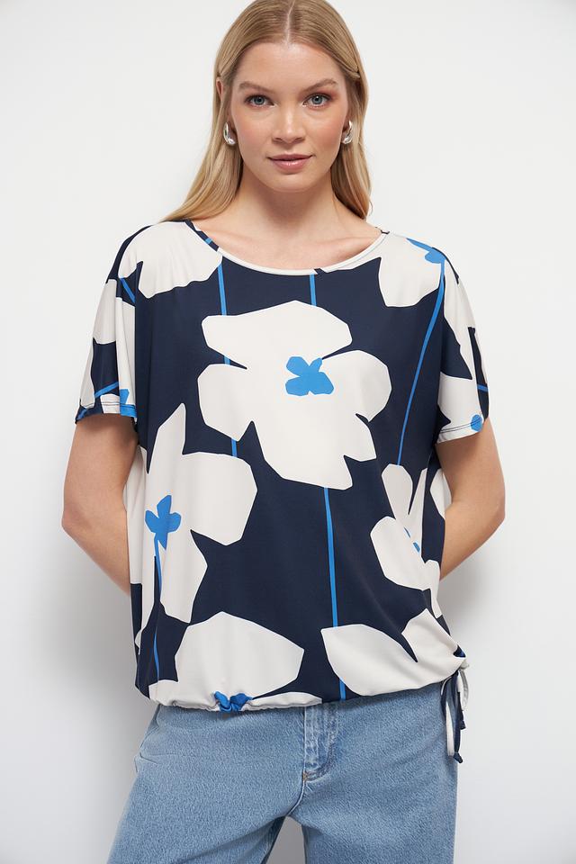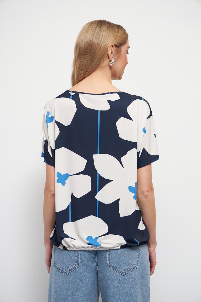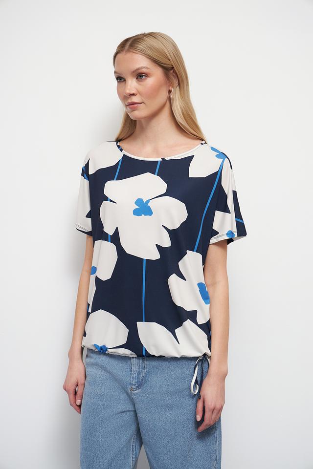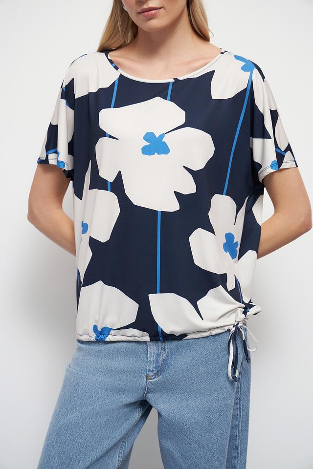 Блуза имеет свободный крой и короткие рукава, что делает ее идеальным выбором для теплой погоды. Яркий цветочный принт в синих, белых и голубых тонах добавляет образу женственности и оригинальности.