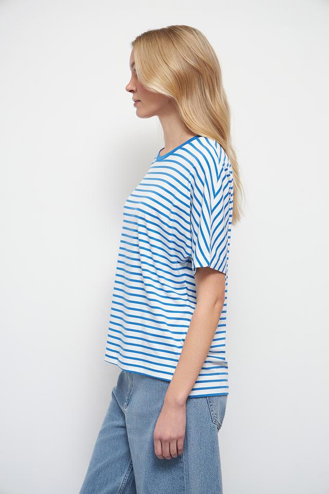 Женская футболка Oui голубого и белого цвета в классическую полоску. Изготовлена из мягкого хлопка с добавлением модала и эластана для комфорта и хорошей посадки. Состав: хлопок 47%, модал 47%, эластан 6%