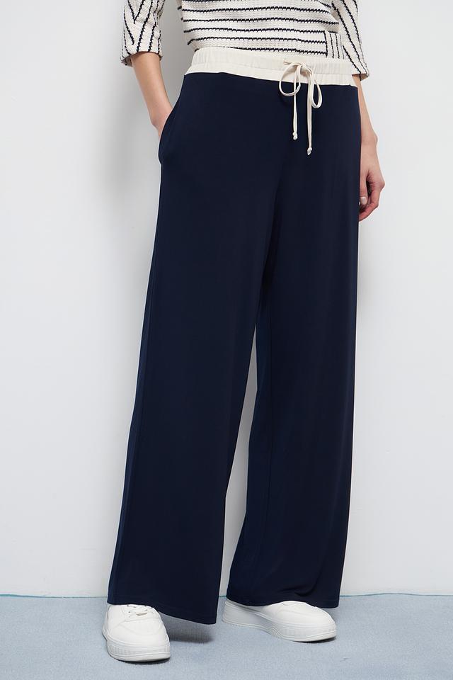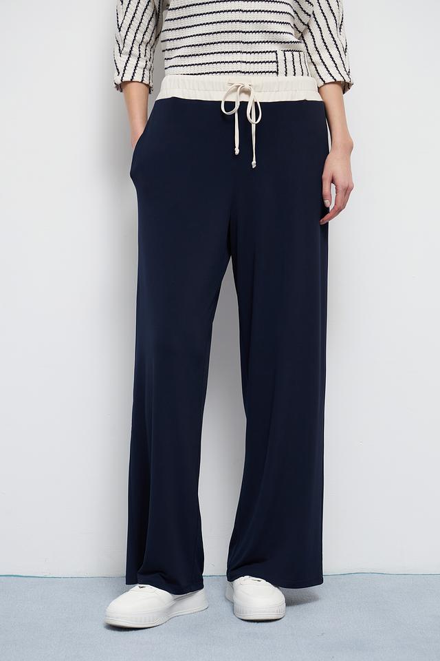 Брюки имеют удобный эластичный пояс с регулируемыми завязками, обеспечивающими идеальную посадку по фигуре. Крой клёш визуально удлиняет ноги и придает образу женственность.