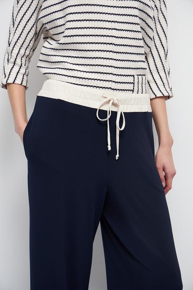 Женские брюки клёш от Oui тёмно-синего цвета с эластичным поясом и завязками. Модель выполнена из мягкой ткани с добавлением эластана для комфортной посадки и свободы движений. Состав: полиэстер 92%, эластан 8%