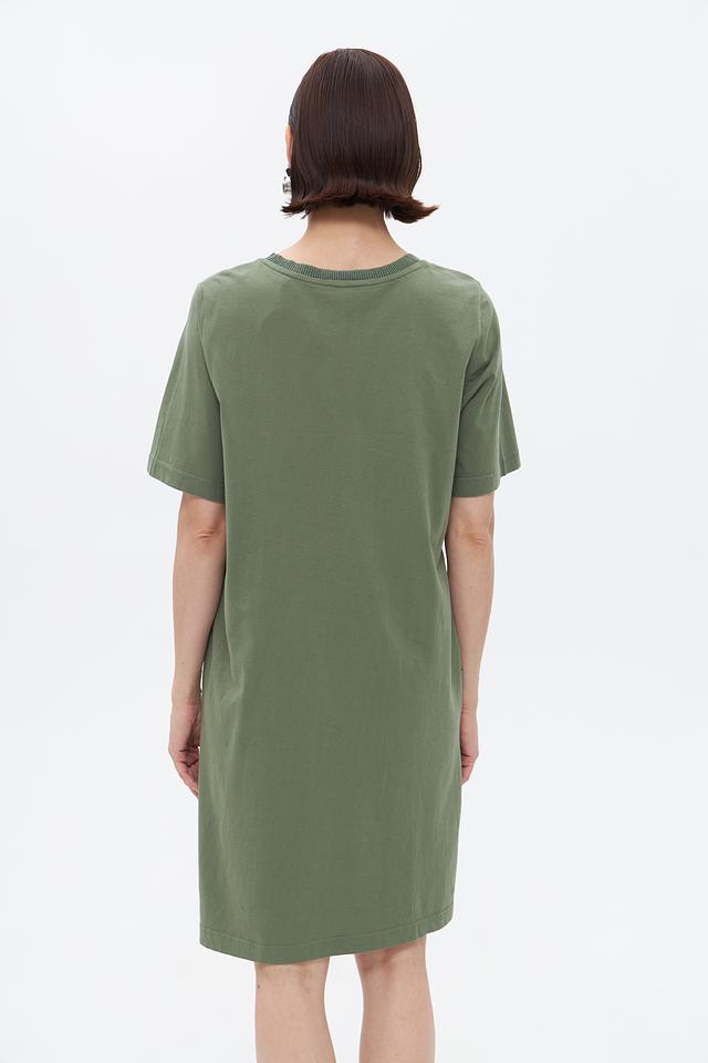 Платье имеет прямой силуэт, короткие рукава и круглый вырез горловины. Отличительной особенностью является вставка из трикотажа в области горловины, добавляющая комфорта и визуального интереса.