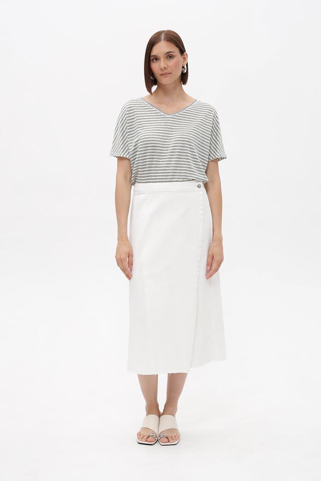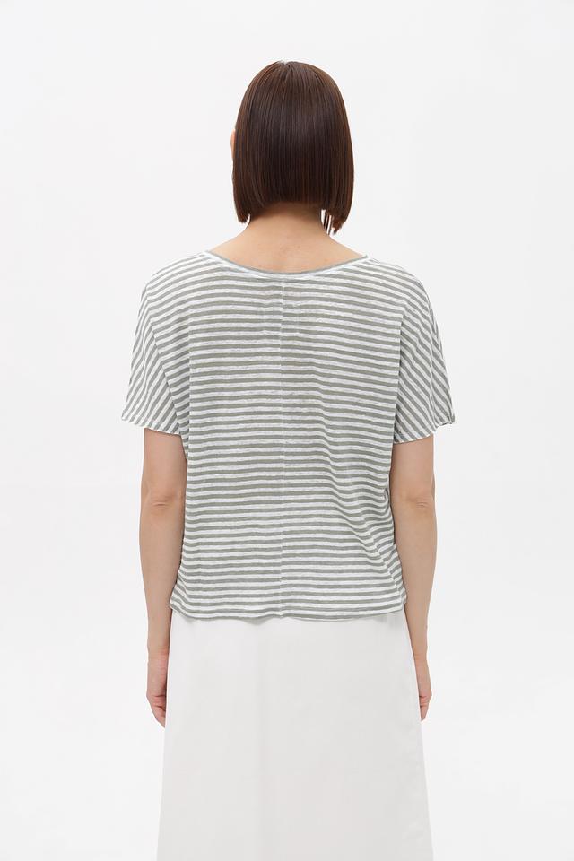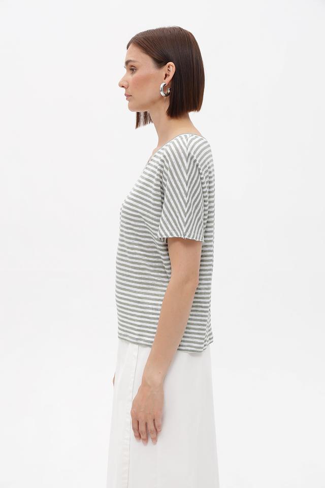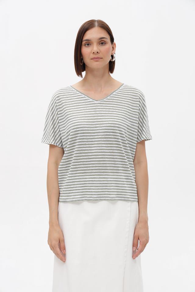 Футболка имеет классический крой с короткими рукавами и V-образным вырезом, что делает её универсальной для различных типов фигур. Полосатый дизайн в серо-зелёных тонах придаёт ей свежий и современный вид.