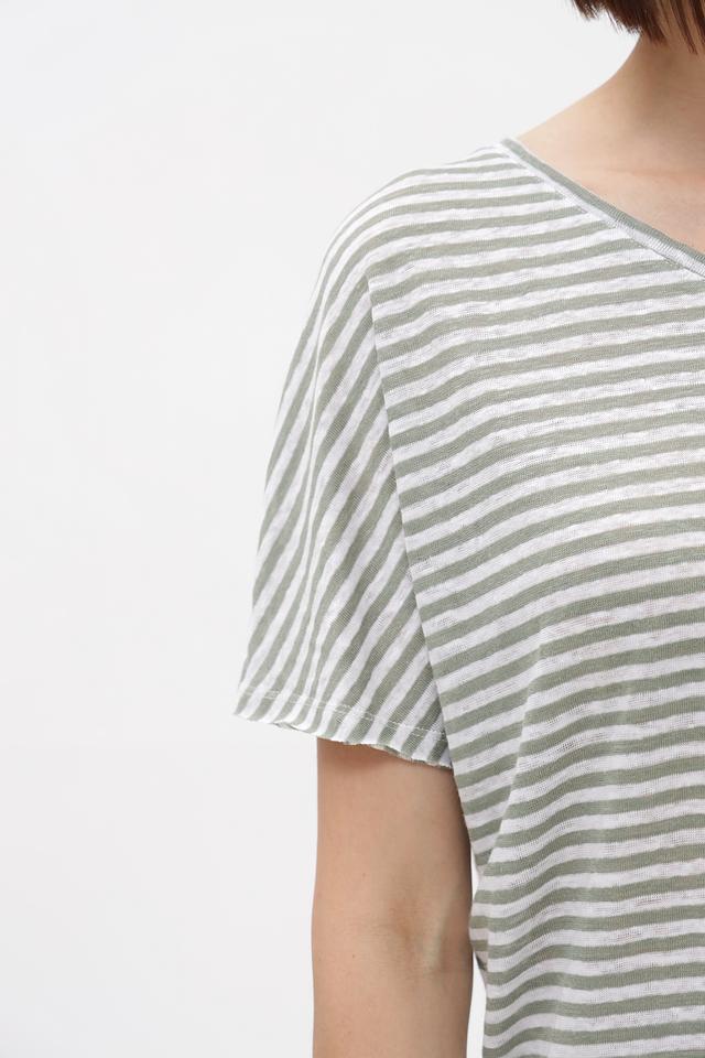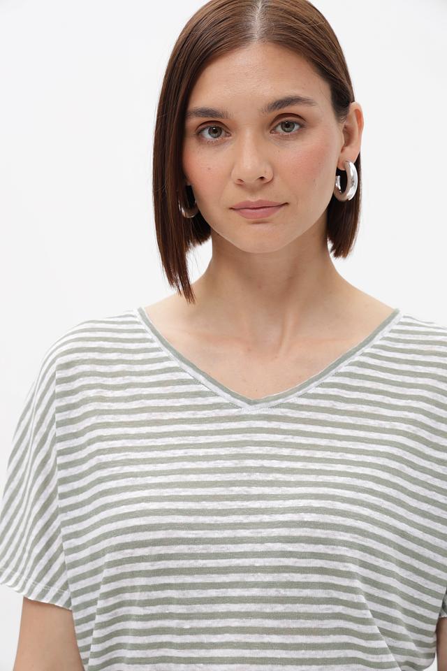 Женская футболка Oui серо-зелёного цвета в полоску выполнена из 100% льна. Лёгкая и дышащая модель с V-образным вырезом станет отличным дополнением к летнему гардеробу. Состав: лен 100%