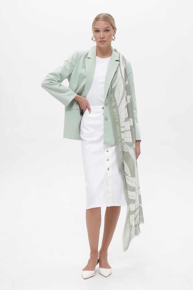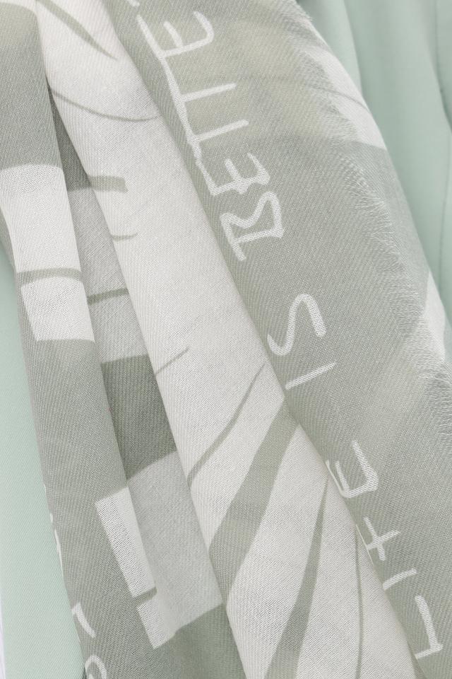 Изящный шарф от бренда Oui станет стильным дополнением к вашему образу. Шарф выполнен в нежном зелёном цвете и украшен оригинальным принтом, изображающим пальмовые листья и надписи.