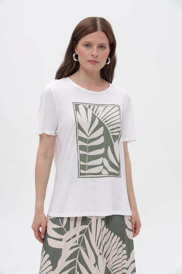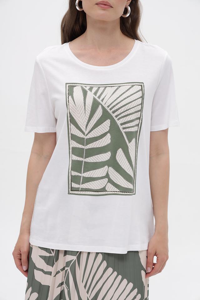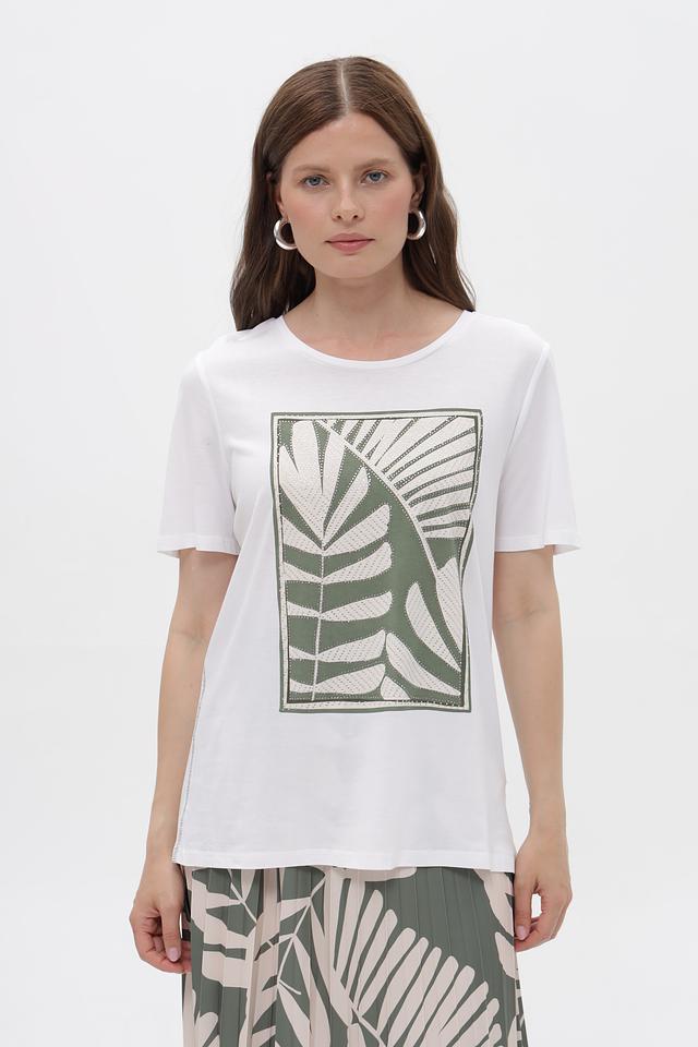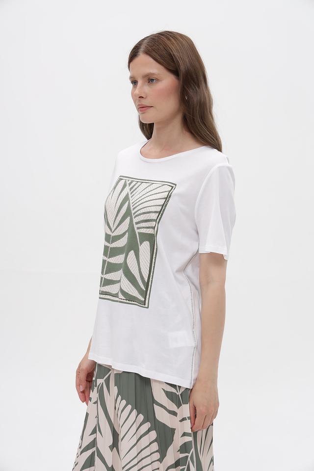 Ключевой особенностью этой футболки является яркий, графичный принт в зелёных тонах, выполненный в виде стилизованных листьев. Принт расположен по центру изделия и придает ему оригинальность.