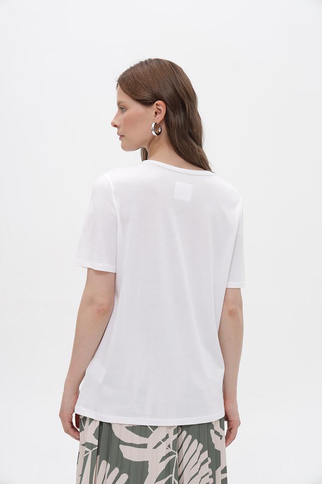 Фасон футболки свободный, с короткими рукавами и круглым вырезом горловины. Это обеспечивает комфортную посадку по фигуре и свободу движений. Футболка идеально подходит для создания как расслабленных, так и более элегантных образов, легко сочетаясь с юбками, брюками и джинсами.