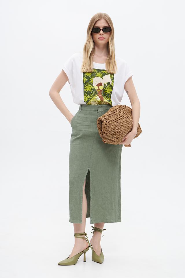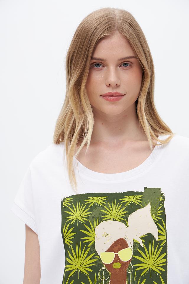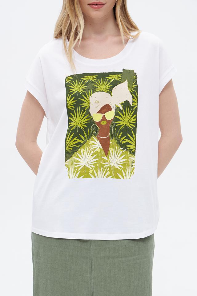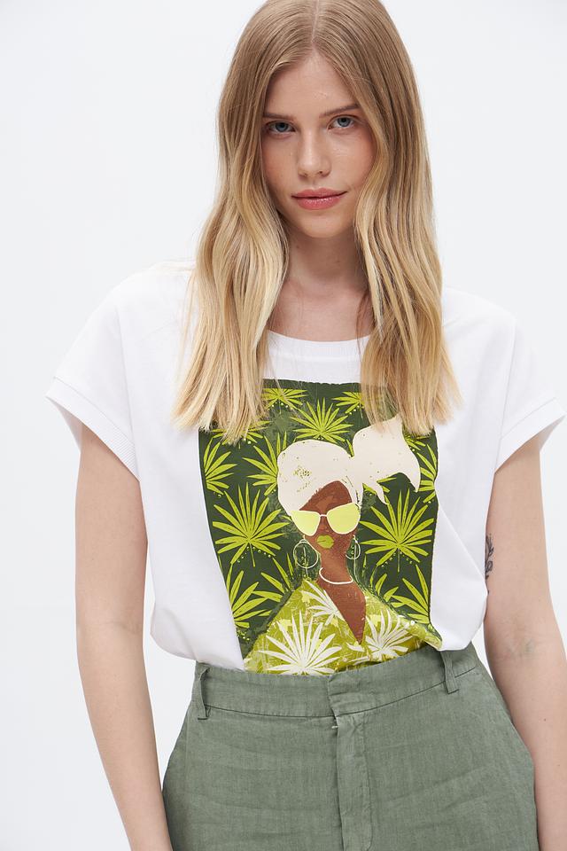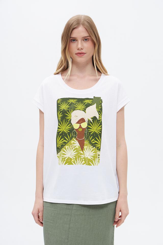 Особенностью этой модели является яркий и красочный принт с изображением женщины в окружении тропической зелени. Принт выполнен в зеленых и коричневых тонах, что придает футболке свежий и летний вид.